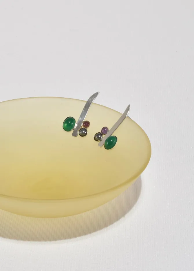 Rare, vintage sterling abstract earrings with multi stone cabochons and sculptural backs, pierced. Stamped,Louis Booth Sterling.