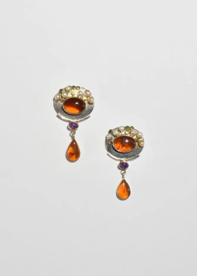 Stunning, vintage statement arts & crafts earrings with amber, amethyst, and pearl detail, pierced. Stamped,925.