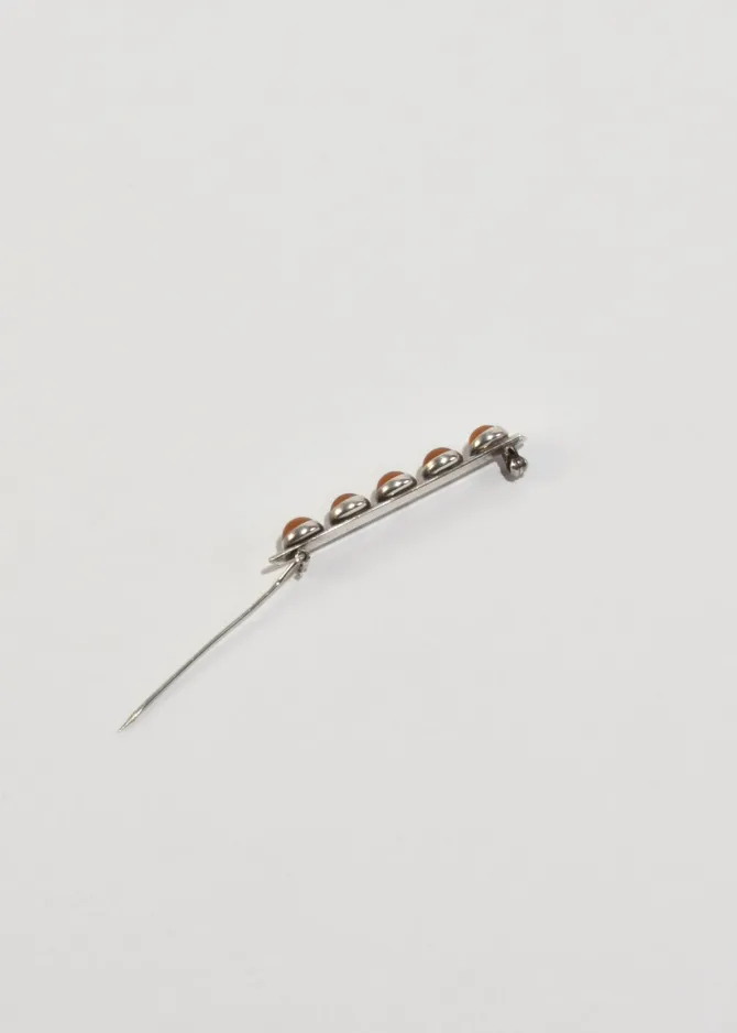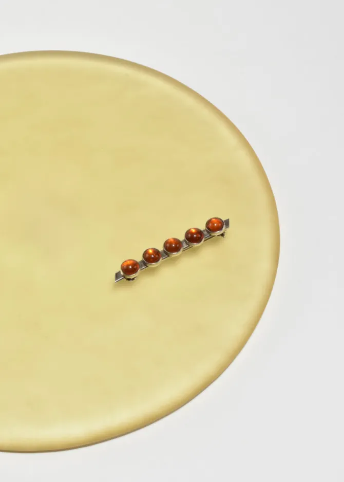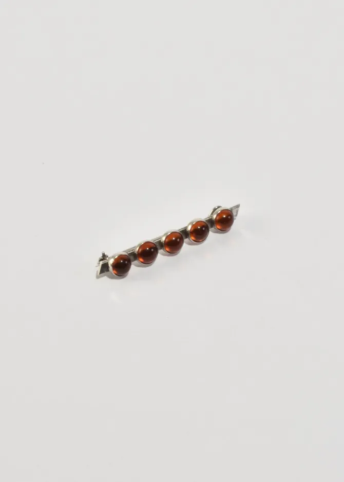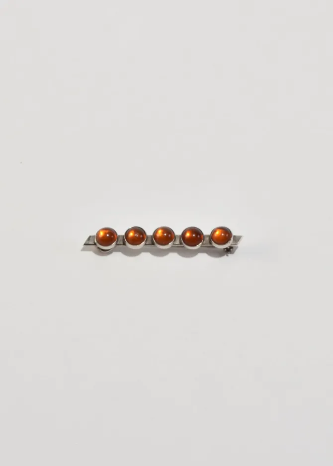 Vintage sterling brooch with a rectangular bar and round amber cabochons, pin-back closure. Stamped,925.