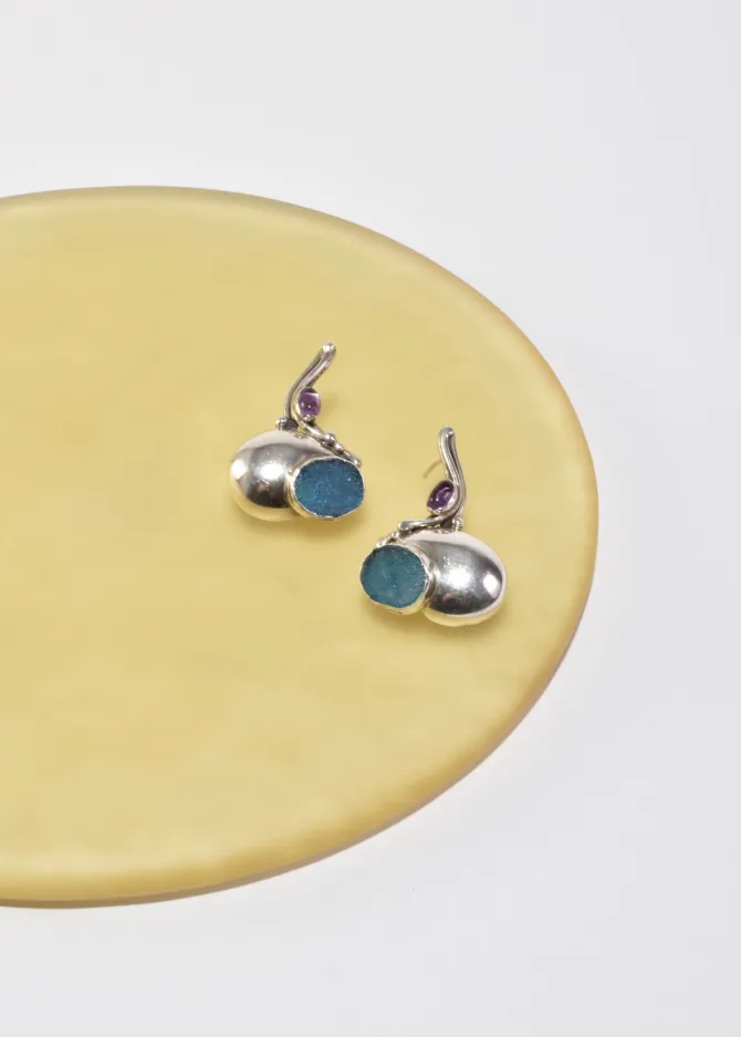 Rare, vintage sterling arts and crafts earrings with amethyst cabochons and textured blue glass detail, pierced. Stamped,925.