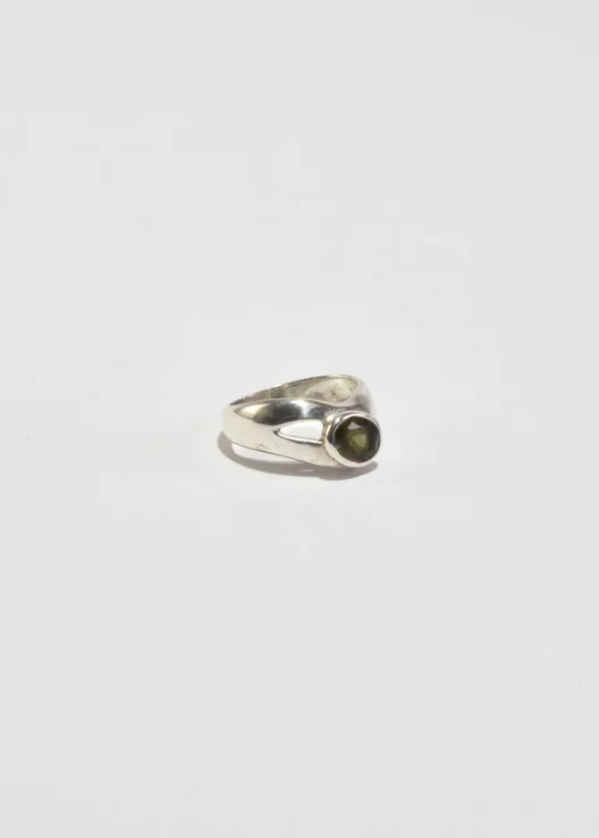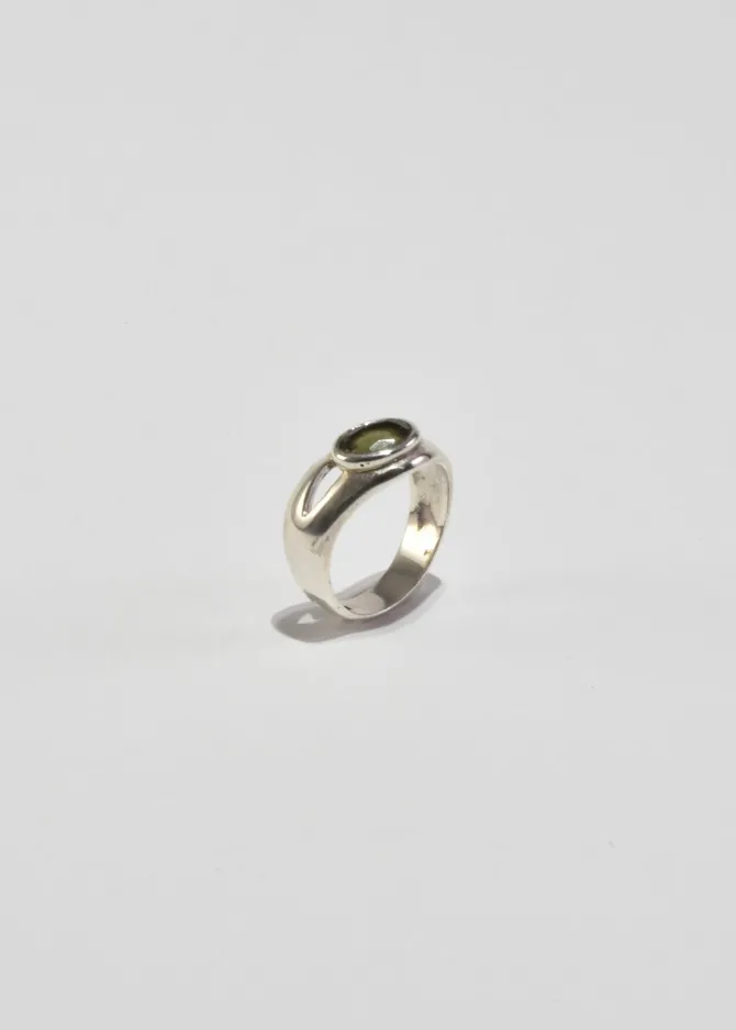 Vintage, sterling ring with an asymmetrical design and an oval faceted peridot stone. Stamped,925.
