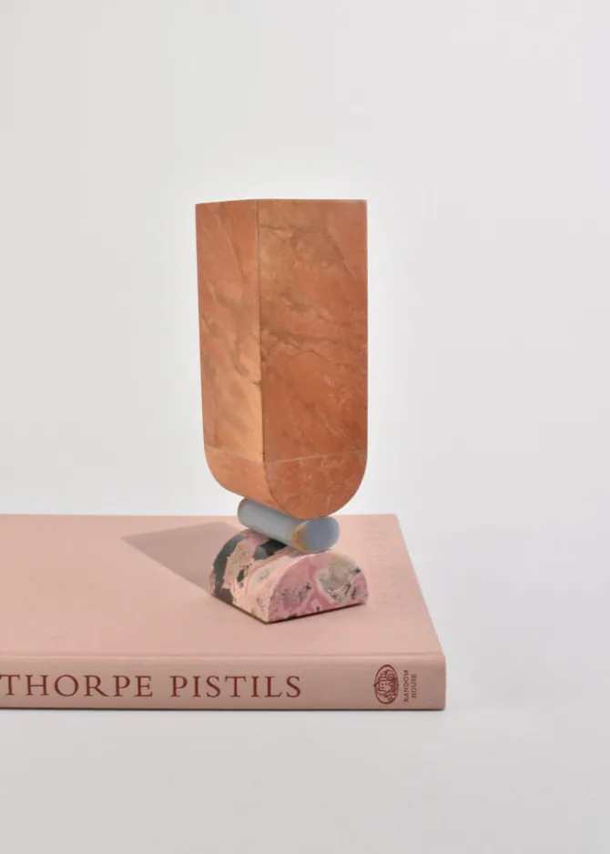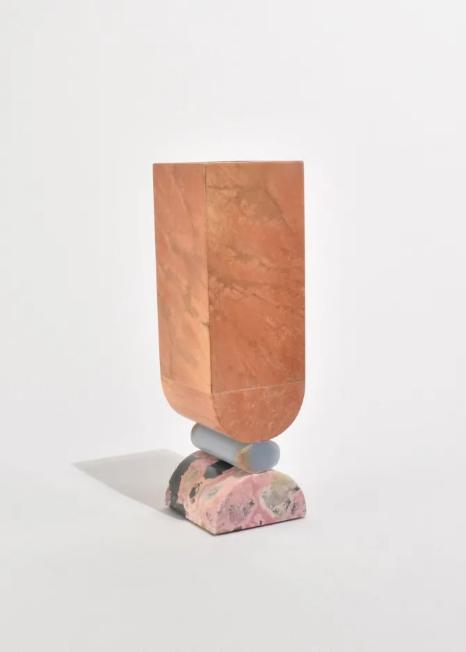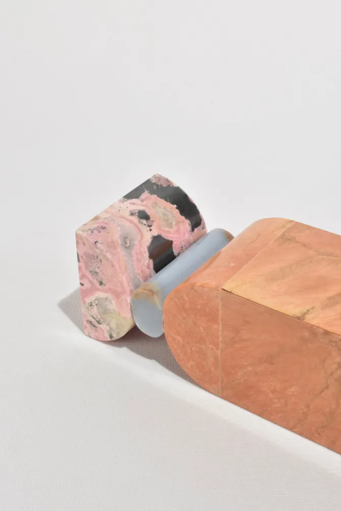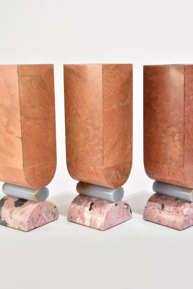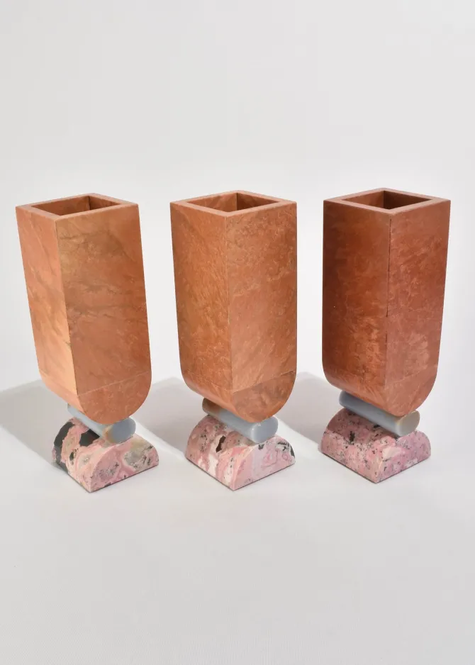 A polished jasper vase with a blue celestine and pink rhodonite base. Perfect for grounding a single stem, arranging a subtle bouquet, or standing alone as a sculptural centerpiece. Handcrafted in Perรบ, designed by Casa Shop.