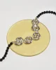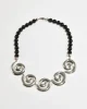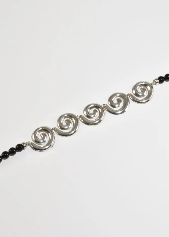 Vintage necklace with sterling spiral links and black round glass beads, filagree closure.