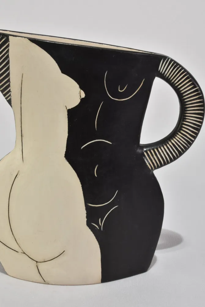 Nude forms āBest Friendsā by Jude Jelfs. Slab-built earthenware with vitreous slips and sgraffito. Glazed inside.