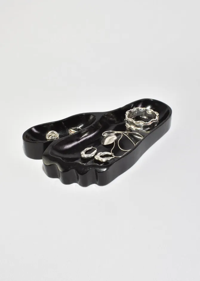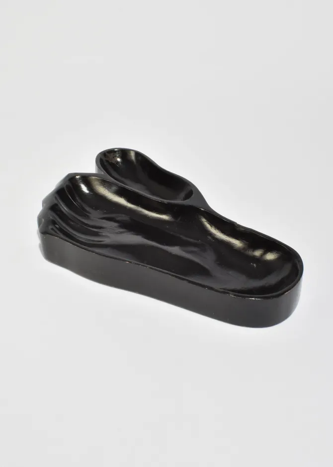 Carved wood foot sculpture or catchall with deep black lacquer finish and sculpted toe compartments. In the style of Alexandre Noll.