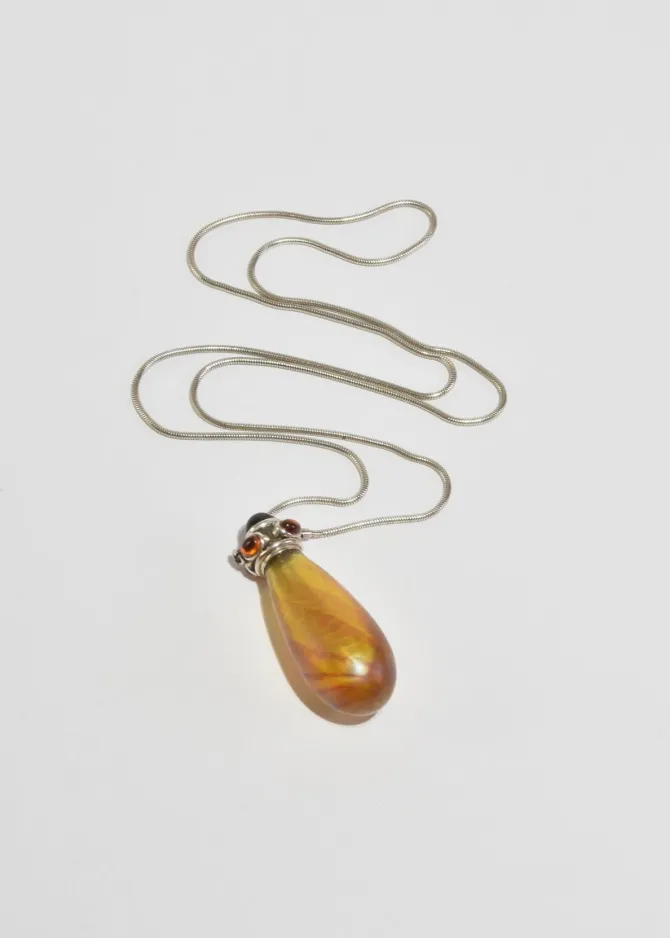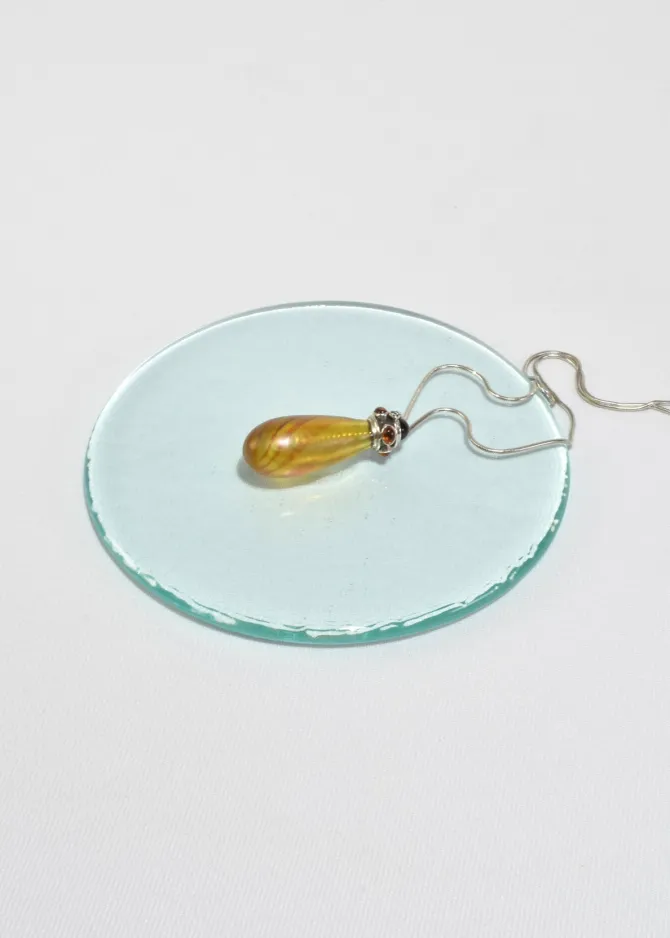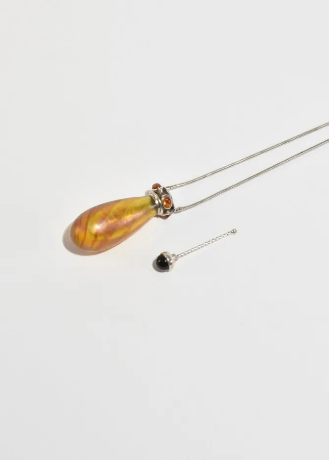Rare, vintage sterling necklace with a blown glass perfume bottle pendant adorned with citrine and onyx stones. Stamped,Ster.