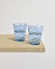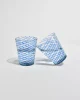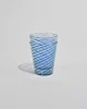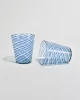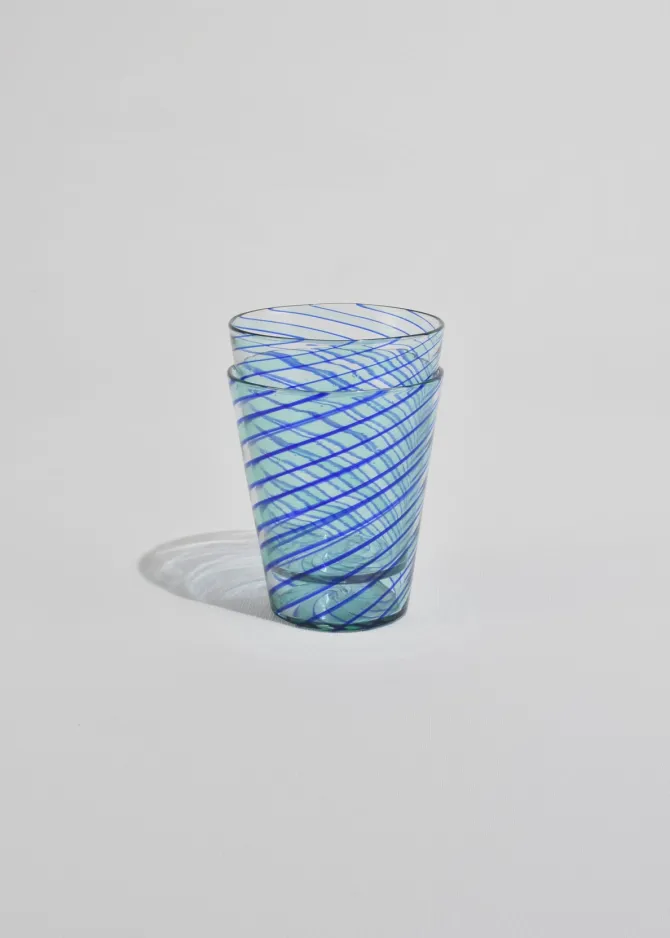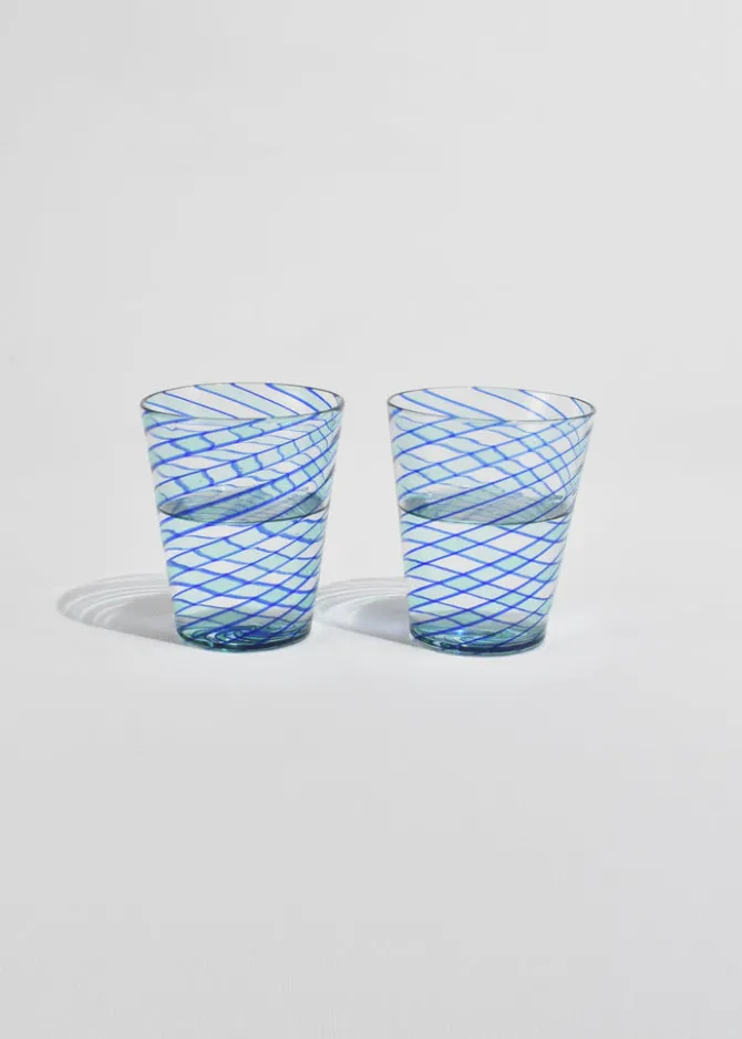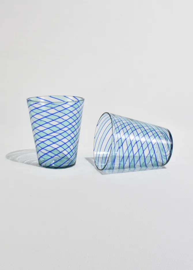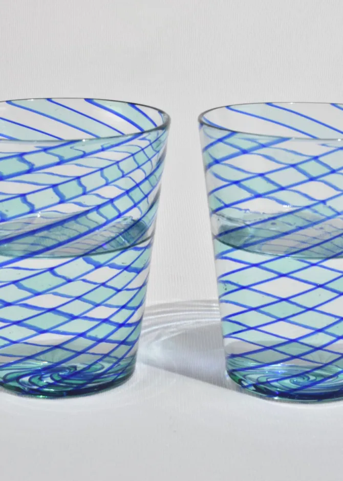 Hand-blown glass tumblers with applied cobalt blue spiral threading over clear glass. Each with slight variations characteristic of artisanal Venetian glasswork. Likely Murano, mid to late 20th century. Sold in a set of two.