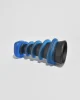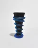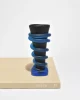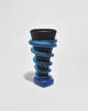 Rare, tapered glass vase by American artist Tommie Rush. Composed of a satin black core encircled by applied cobalt blue coils in a rhythmic spiral. The contrast of velvety opacity and vivid translucence highlights Rush’s signature approach to surface and form. Finished with a softly rounded triangular foot. Base is marked, T Rush.