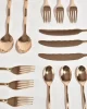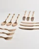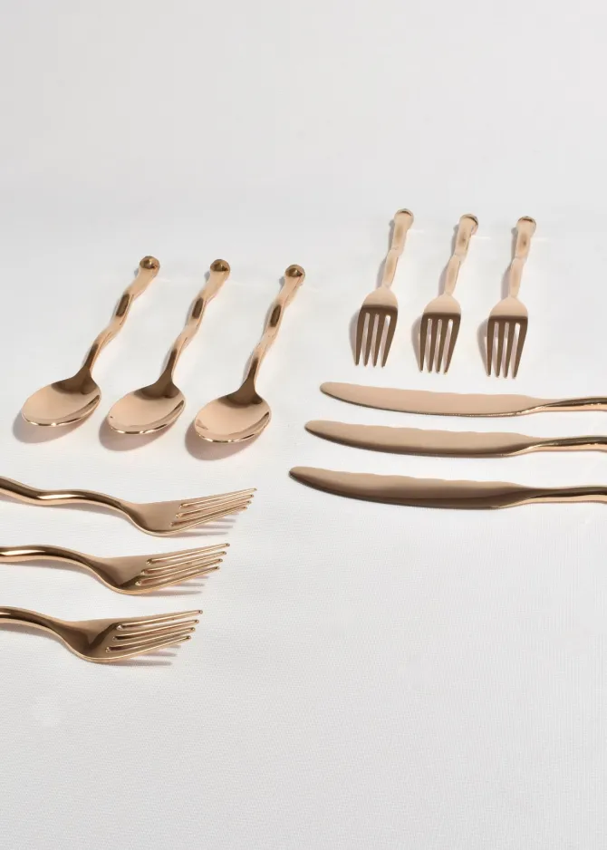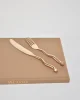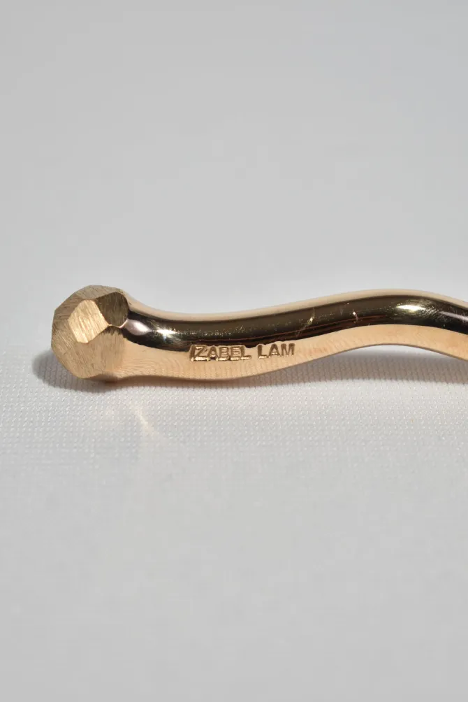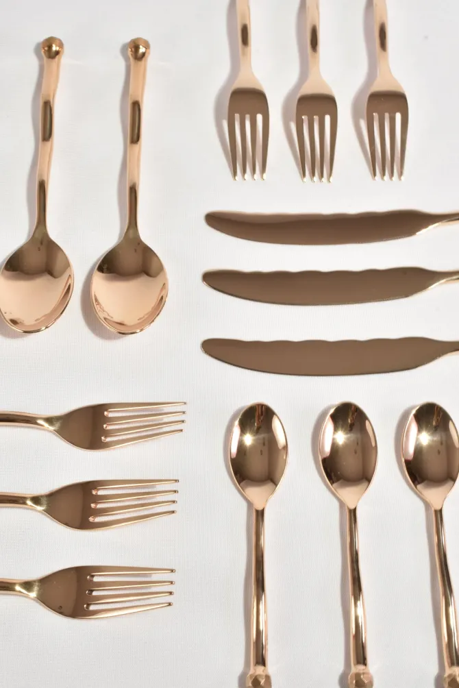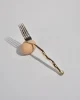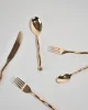 The re-issued 5 piece Sphere flatware set in bronze by Izabel Lam. Each piece features an undulating handle and hammered textured knob on end. Impressed above knob on underside of handle: ‘IZABEL LAM’.
