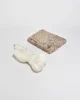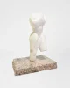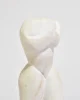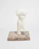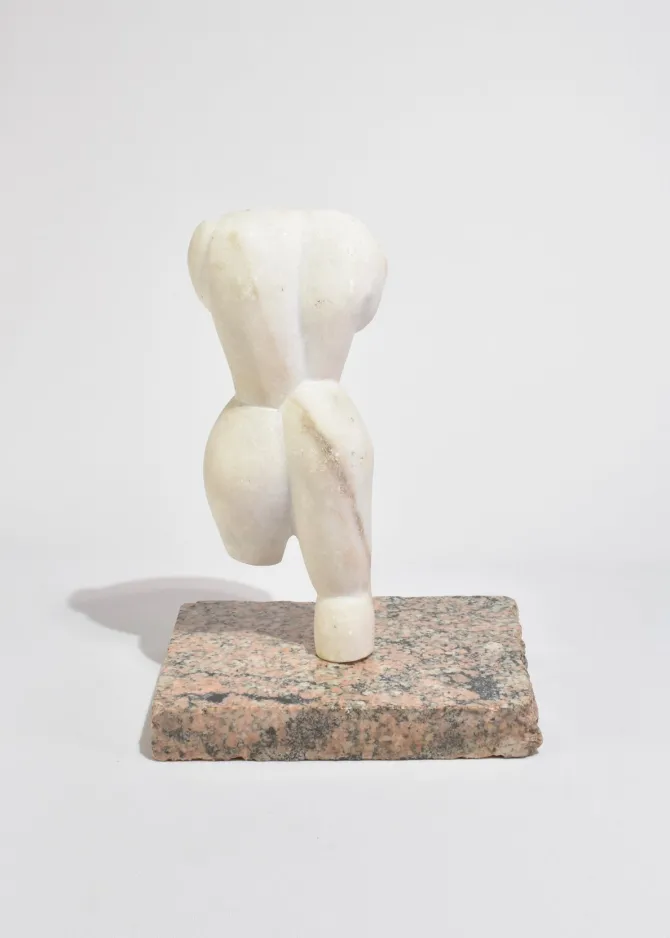Carved stone torso in smooth white marble with stylized, angular curves and softened edges. The figure rests on a substantial speckled granite base in tones of pink, grey, and black; base is removable.
