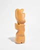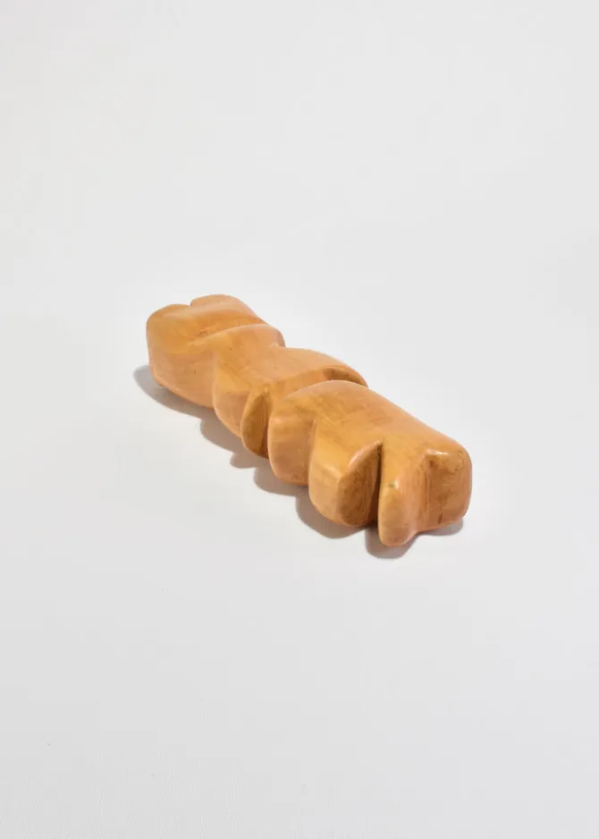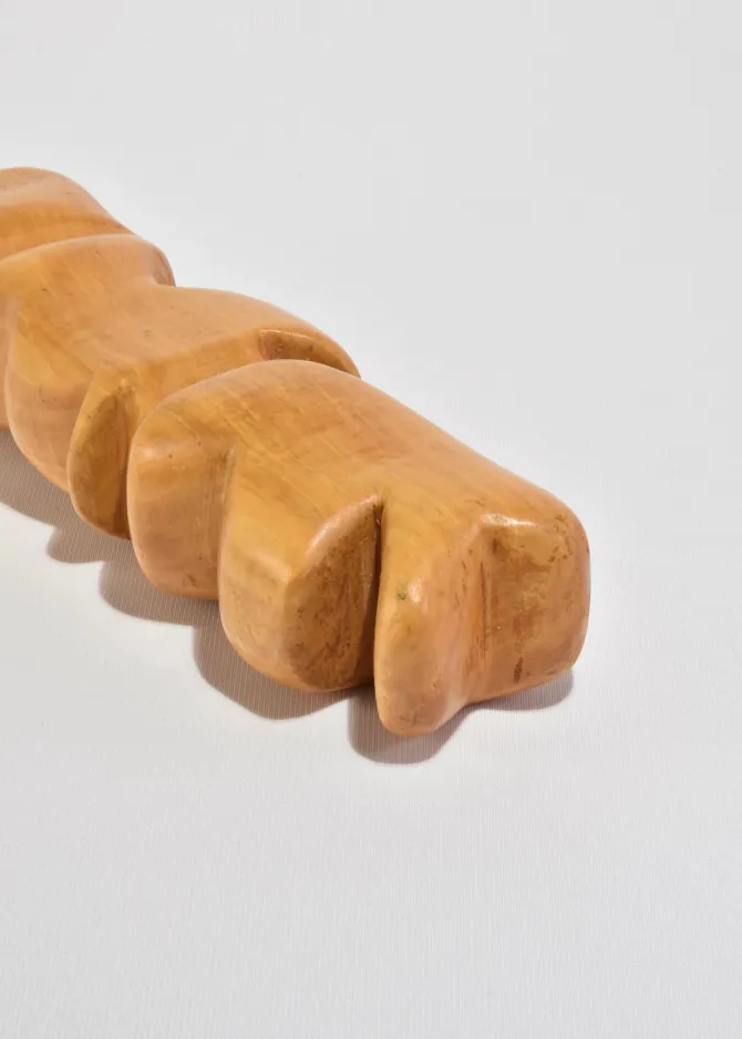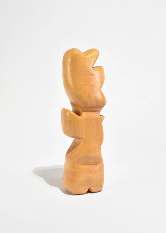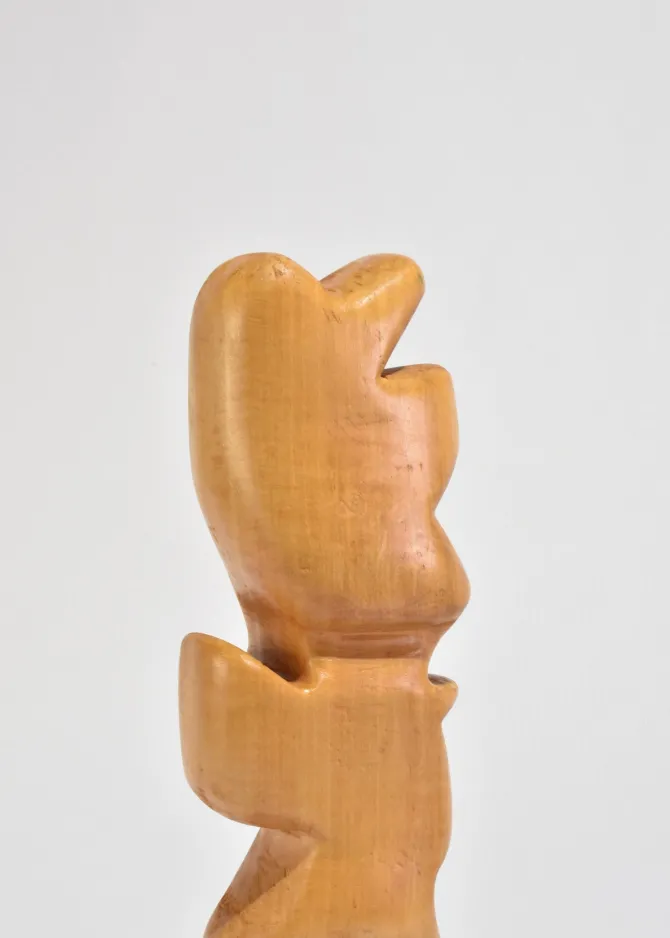 Abstract carved wood sculpture with a smooth, organic form. The sculpture evokes both totemic form and midcentury expression. Faint signature on the base.