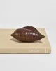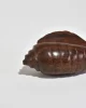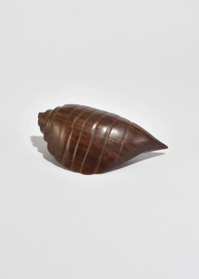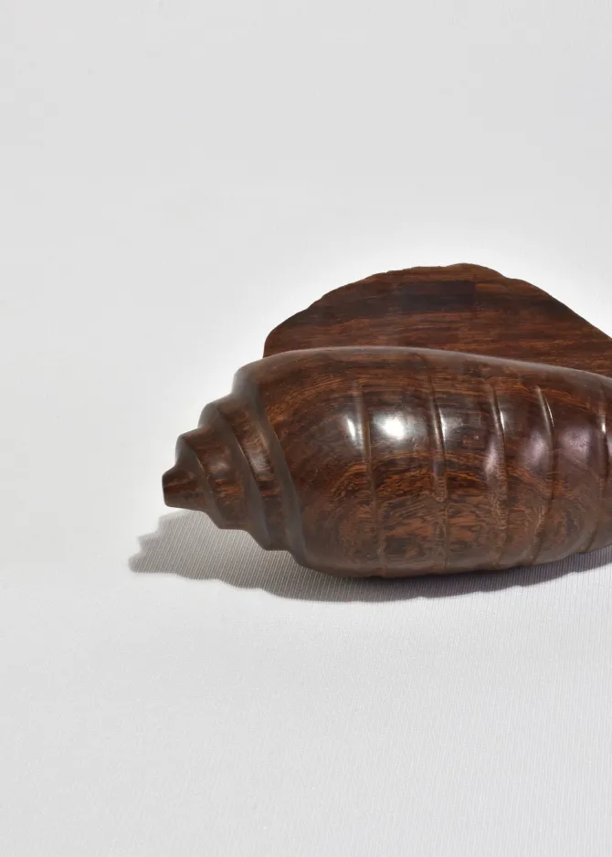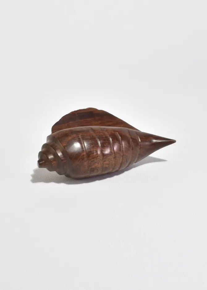 Hand-carved sculpture in the form of a stylized conch shell, shaped from richly grained hardwood with faceted ridges and a smooth tapering point. A warm, sculptural accent with a beautiful hand-finished surface.