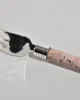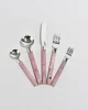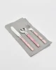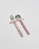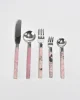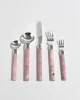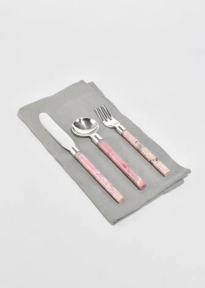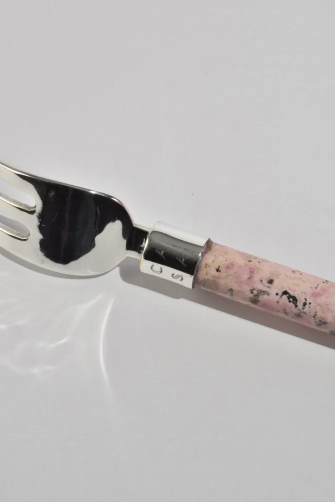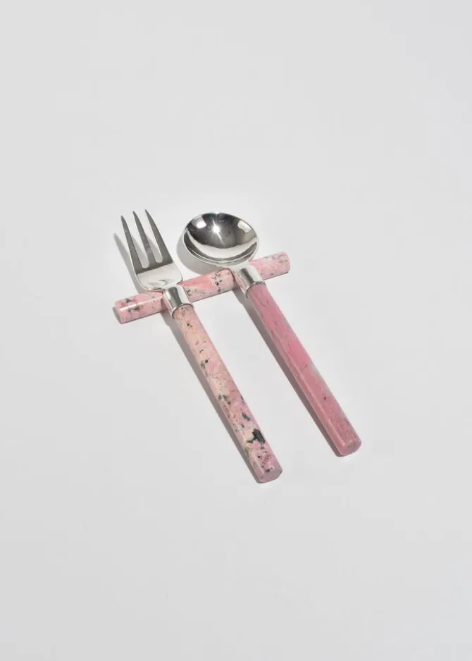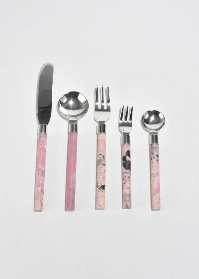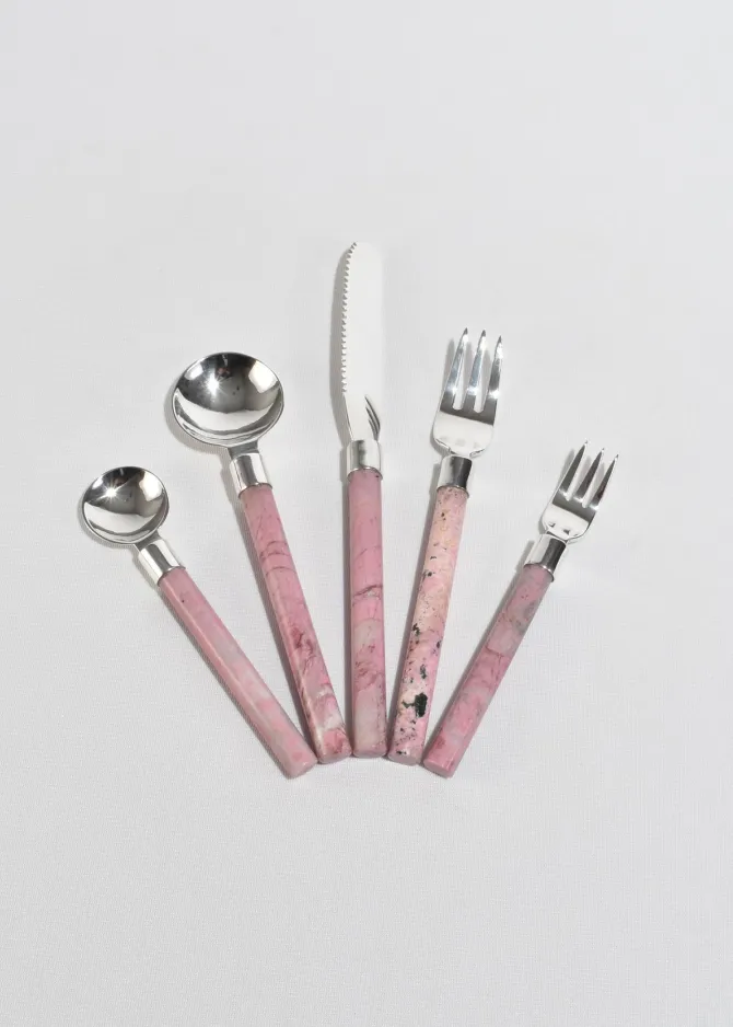 A sculptural cutlery set, combining silver-plated brass with pink rhodonite stone handles for a tactile, refined dining experience. Each set includes five pieces: a dinner fork, salad fork, dinner knife, soup spoon, and dessert spoon. Each piece is stampedCASA.
