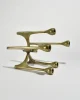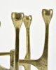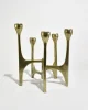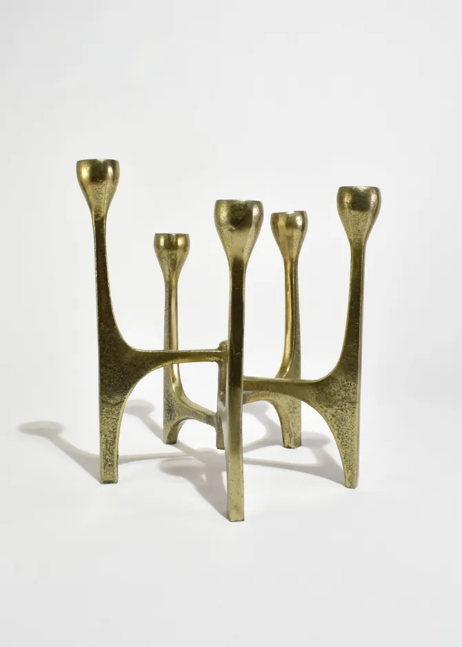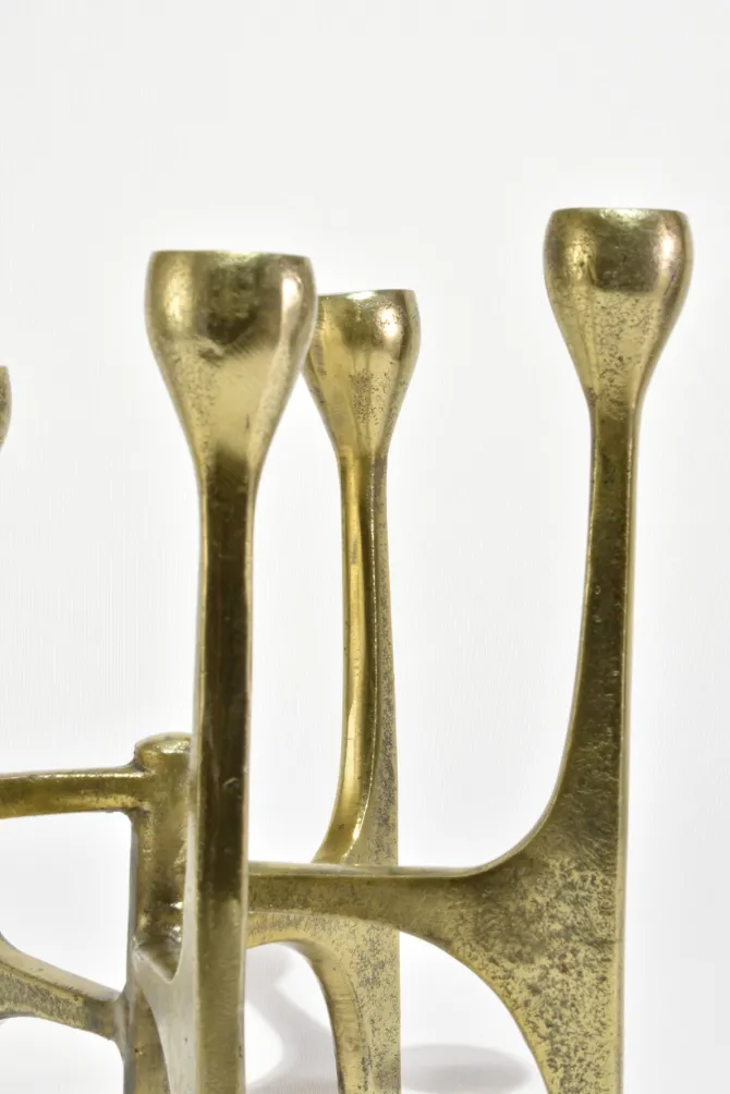 Cast brass five-arm candelabra with a sculptural, architectural form and a softly aged patina. In the style of Michael Harjes.