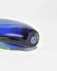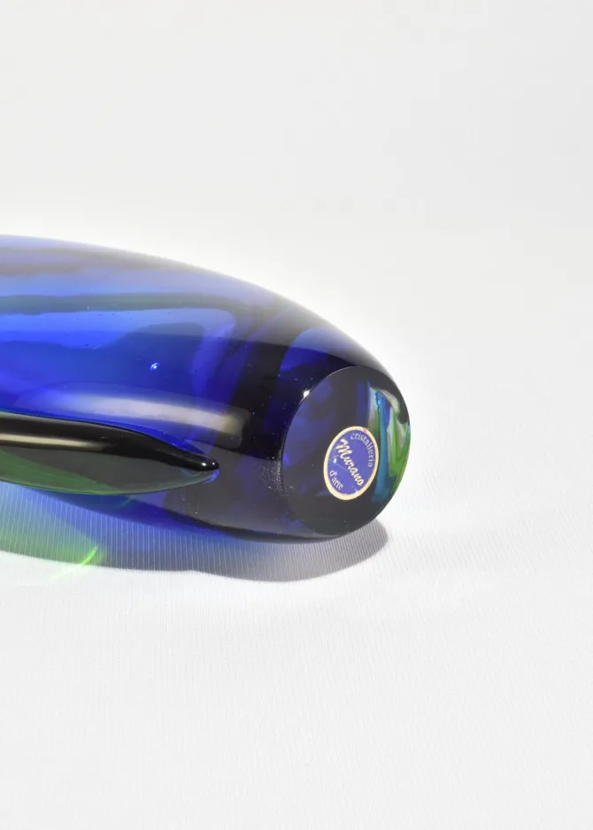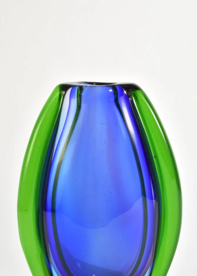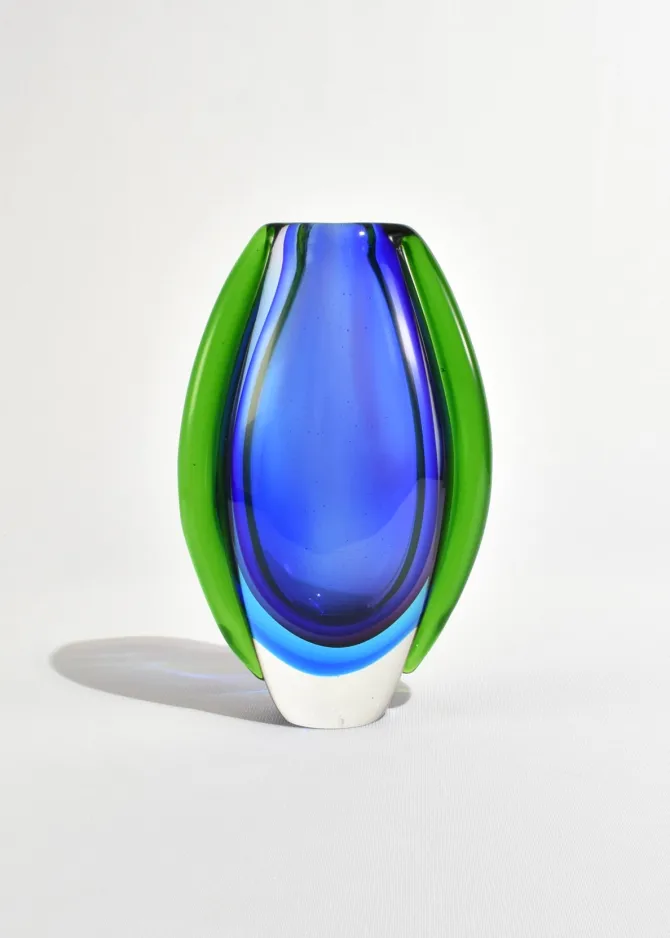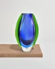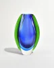 A sculptural Murano glass vase in deep cobalt blue with bright green encasement, its form built from layered sommerso bands that taper into a clear base. Retains the original โMuranoโ foil label on the base. Made in Italy.