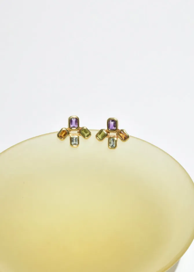Beautiful vintage gold earrings with faceted amethyst, citrine, peridot, and topaz stones. Pierced.