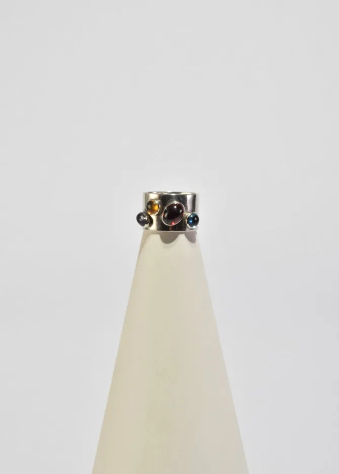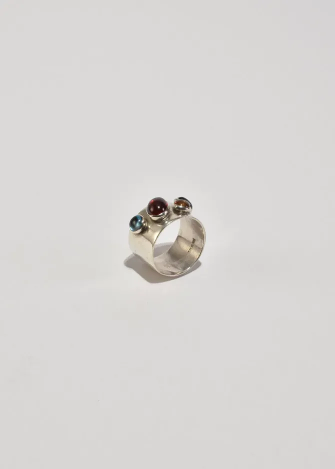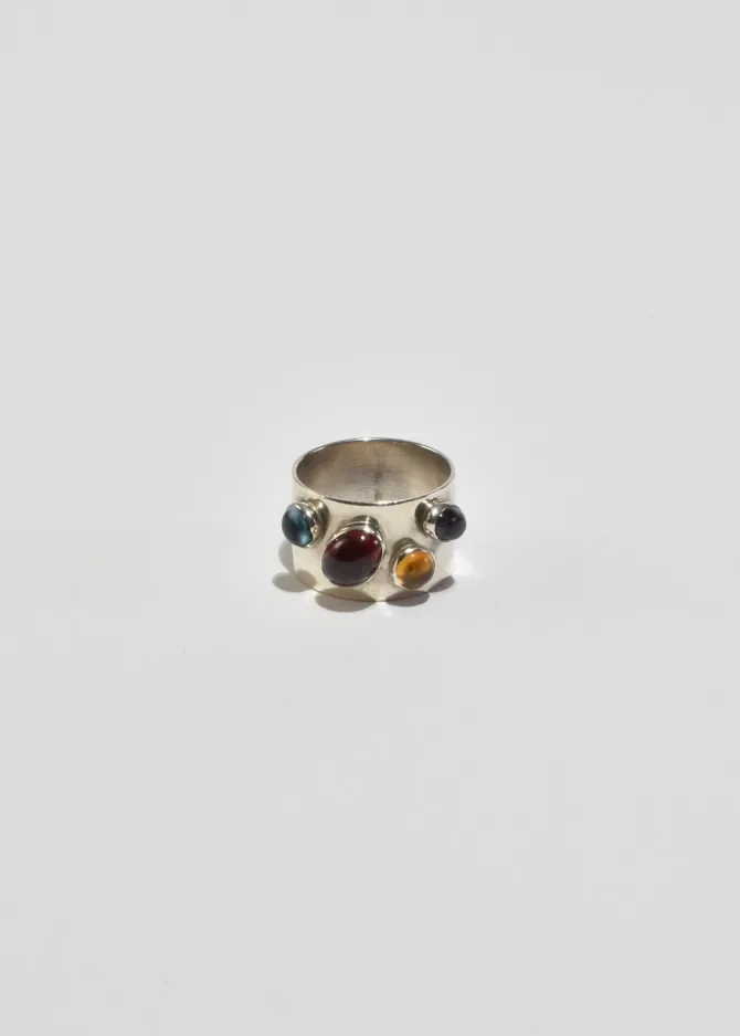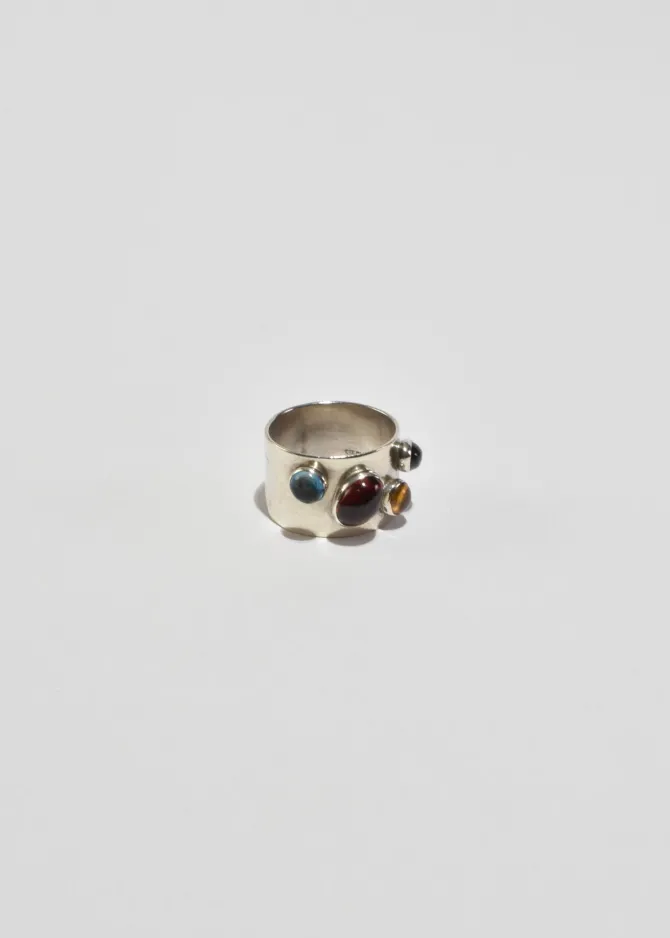 Vintage, sterling wide band ring with colorful stone cabochons. Stamped,Sterling.