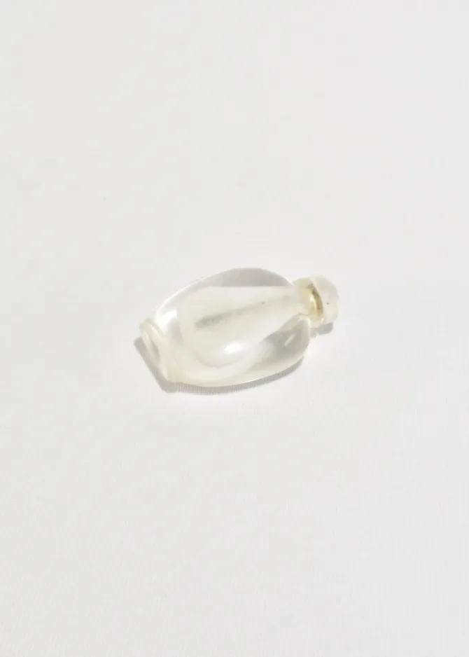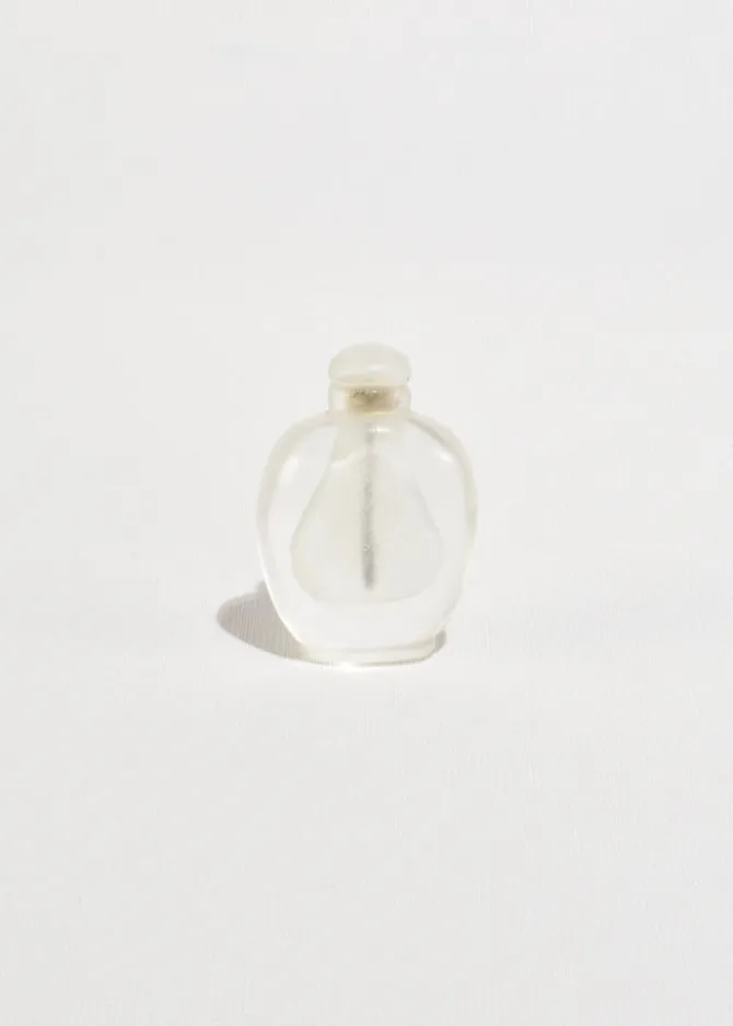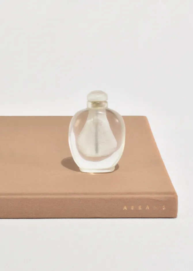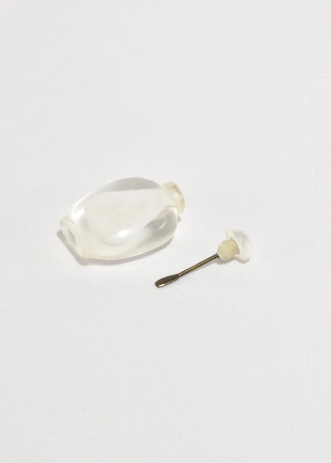 A vintage hand-carved snuff bottle crafted from rock crystal. Beautiful as a standalone decorative piece or perfect for holding a cherished scent.
