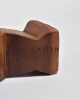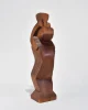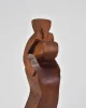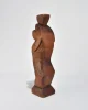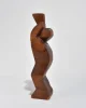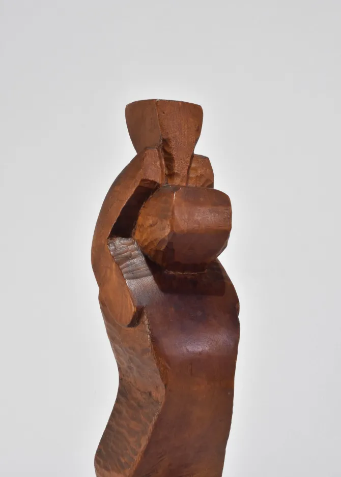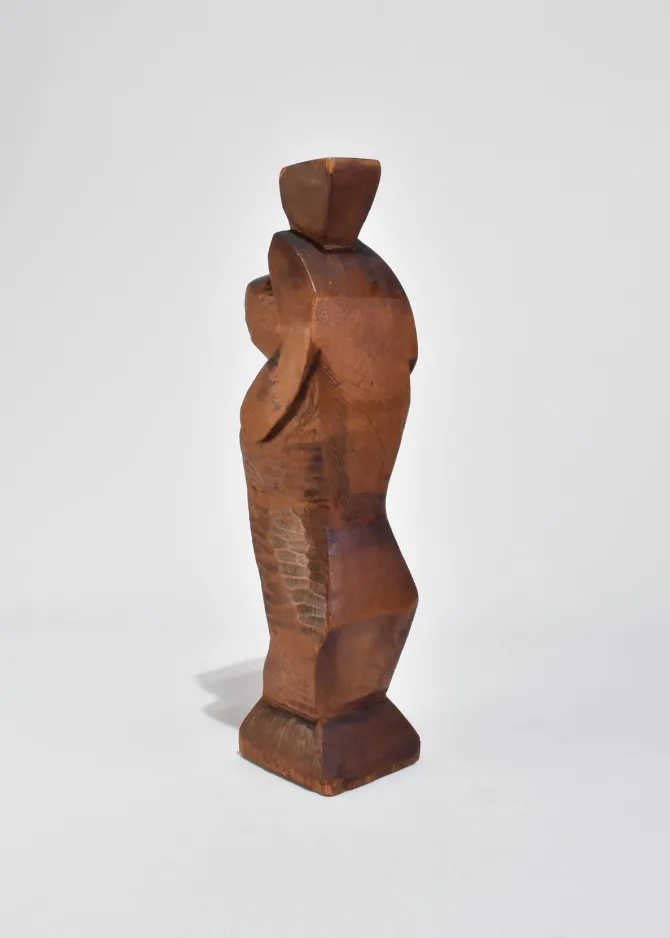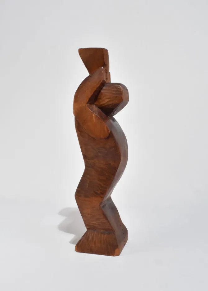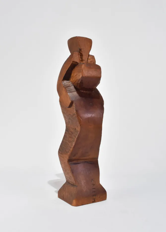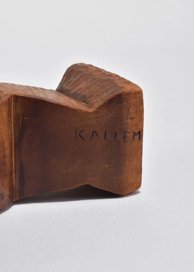 Abstract hand-carved wood sculpture with a stepped, angular form and faceted planes. The silhouette evokes Cubist influences with its blocky geometry and softened edges. Signed Kallem at the base.