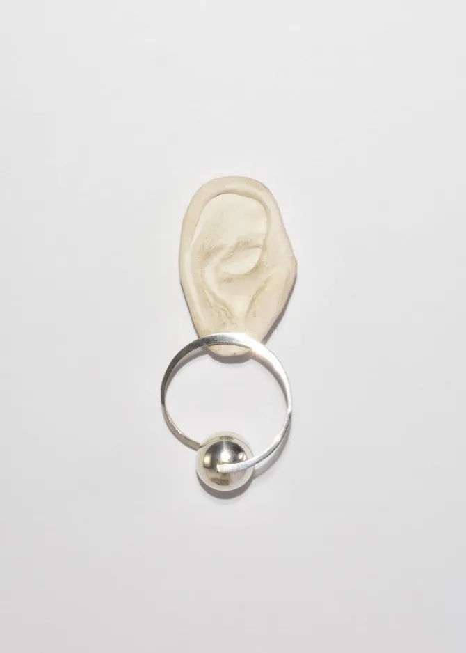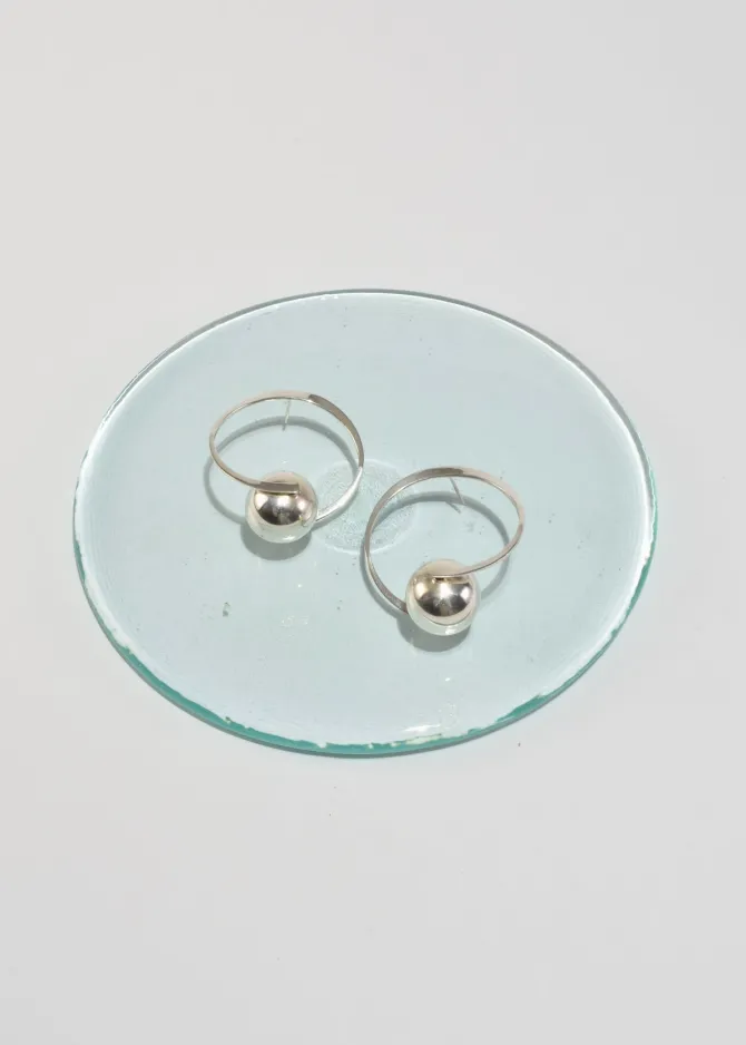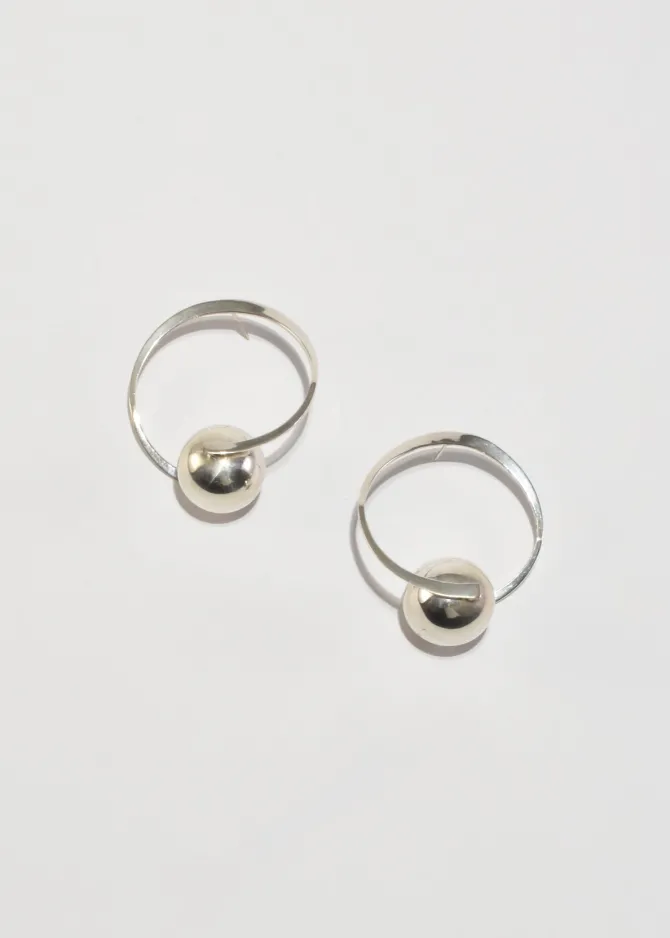 Vintage sterling oversized earring in a curved shape with sphere detail, pierced. Stamped, 925.
