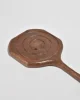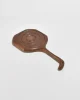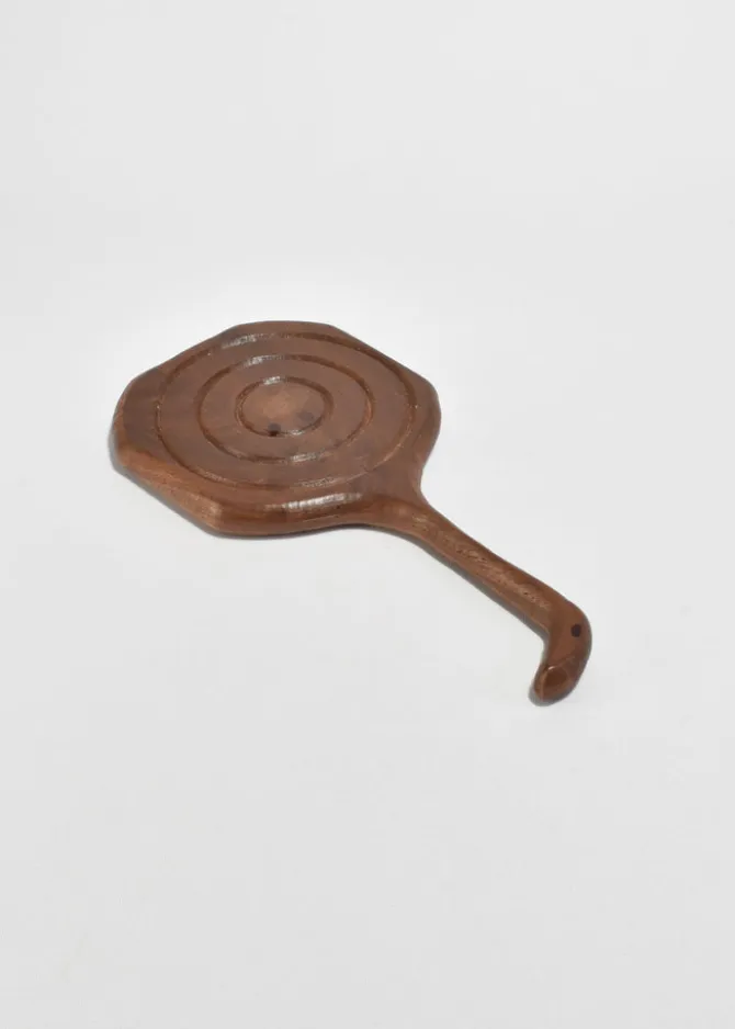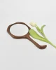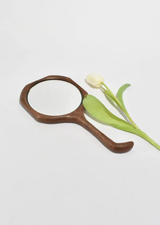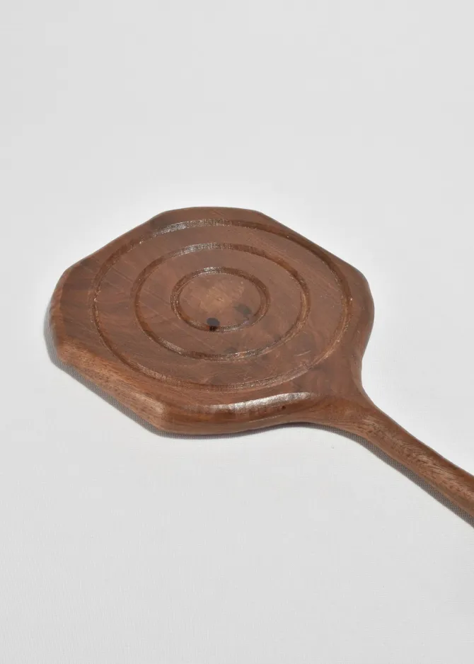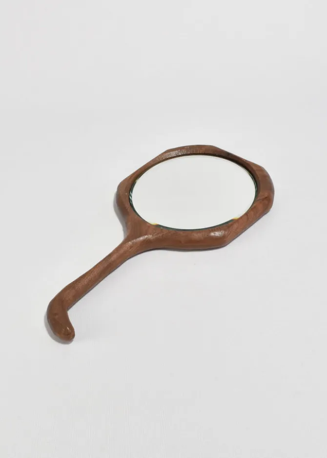 Vintage hand-carved wooden hand mirror with a curved handle and spiral detail on the backside.