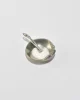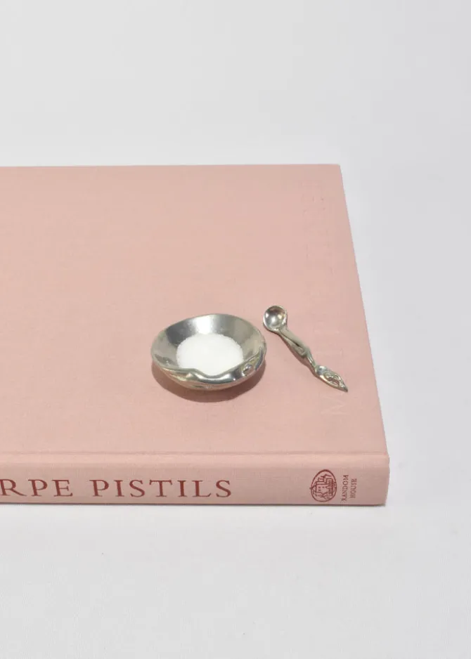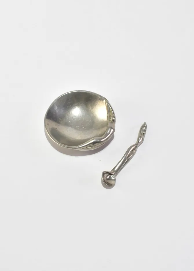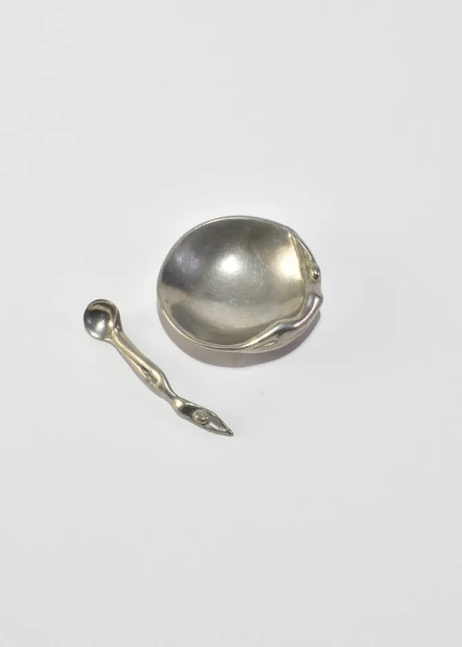 A sculptural vintage Danish dish and spoon set cast in metal with fluid, organic forms. The shallow bowl features a reclining figure along the rim, mirrored by the spoonโs handle, which is shaped as a poised diver. A tactile set suited for serving salt or caviar, or for keeping rings and other small treasures. Ca. 1960s.