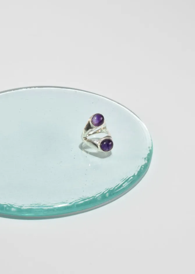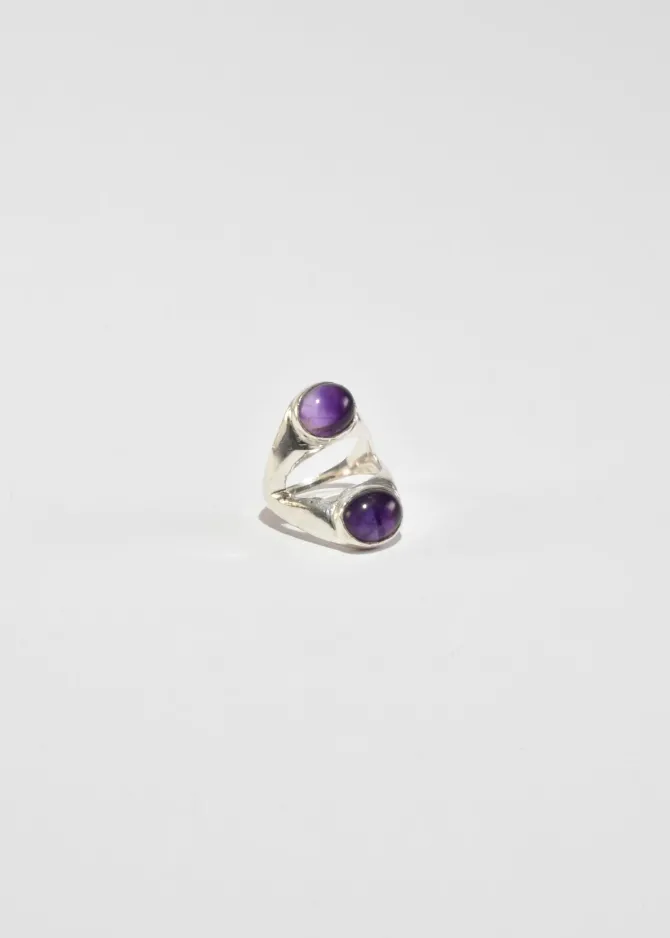 Vintage, sterling ring in a sculptural shape with two oval amethyst cabochons. Stamped,925.