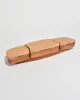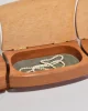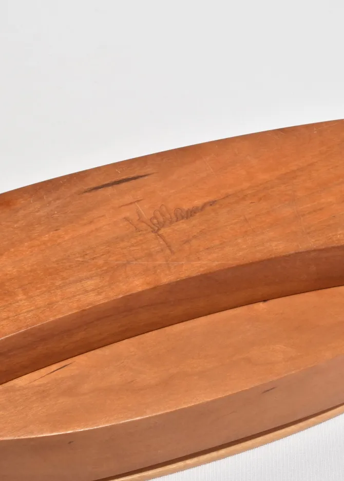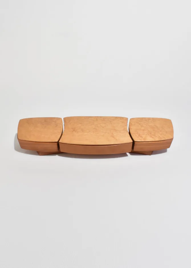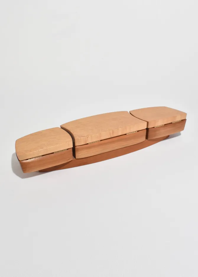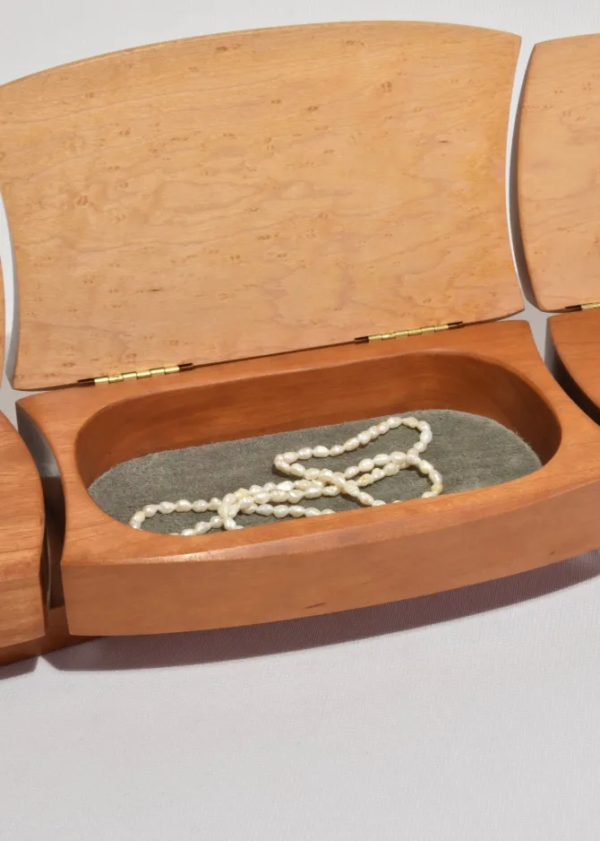A sculptural jewelry box crafted from smooth, curved wood with three hinged lids. Opens to reveal grey suede-lined compartments for rings, earrings, or small keepsakes. Signed on the base: Kellam.