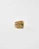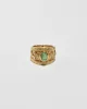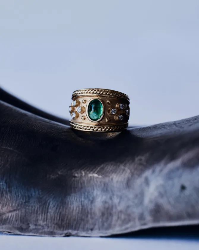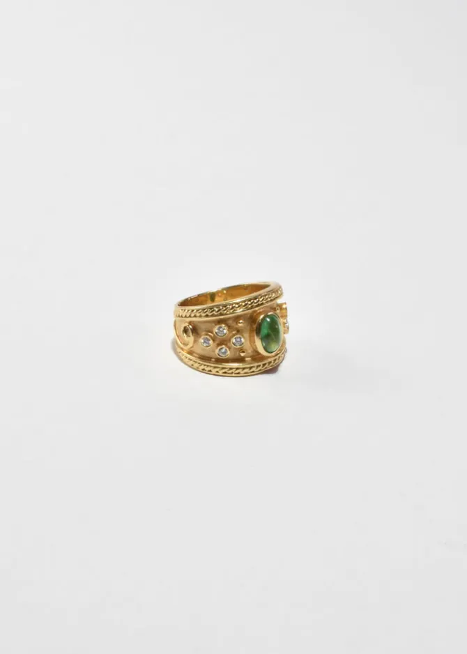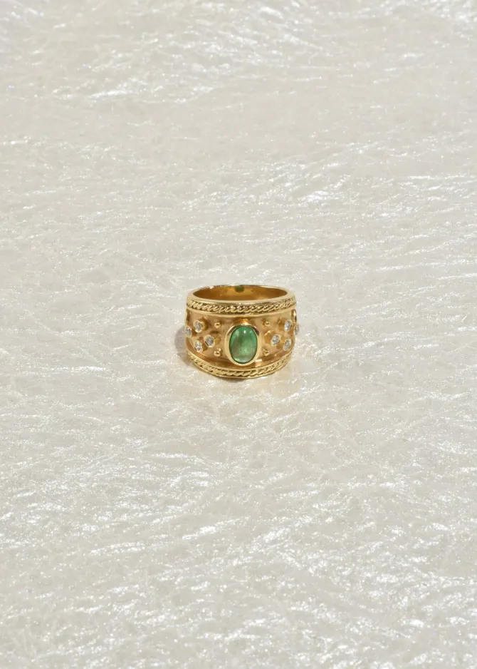 Rare, vintage ornate gold ring with an oval emerald cabochon and eight round diamonds. Stamped14k580 Hong Kong EA.