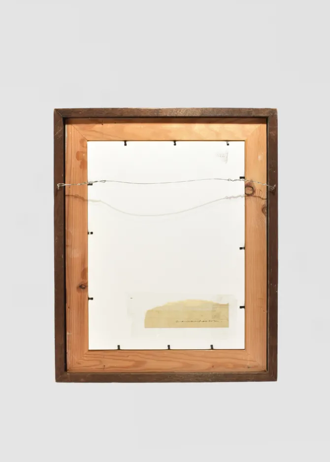 Framed under glass in a wide wooden frame with linen-covered matte and gilt inner border. Wired on the back for hanging.