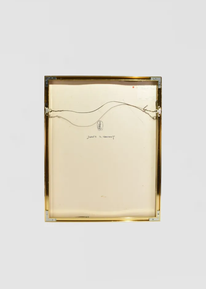Presented under glass in a slim brass-toned frame with a gray mat and wire on the backside.