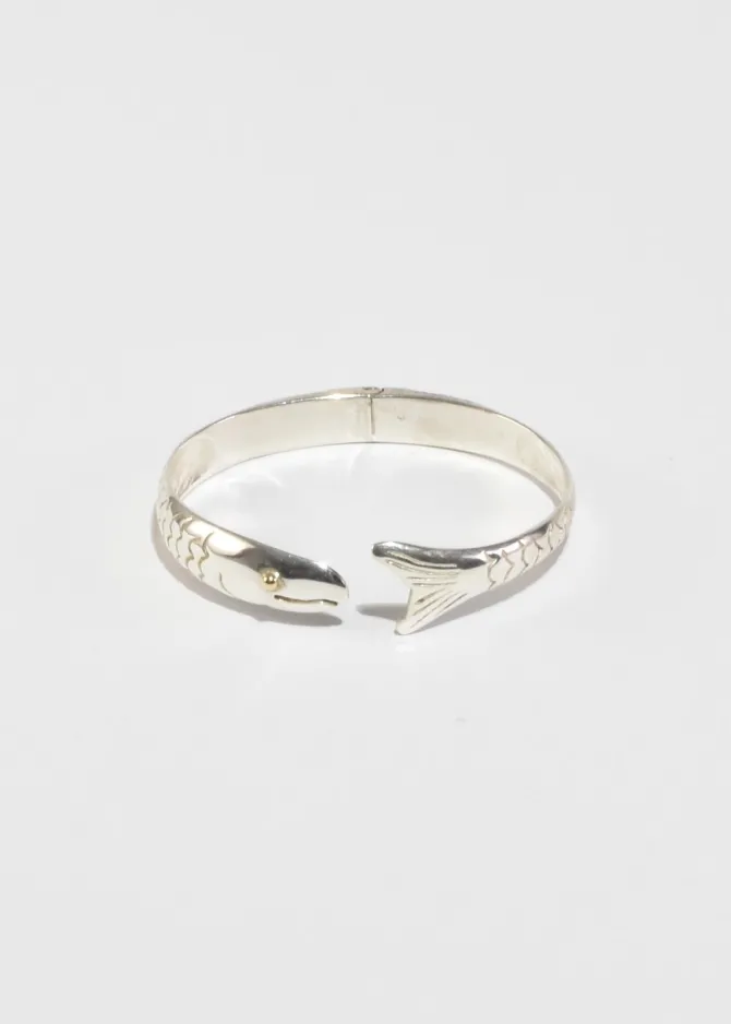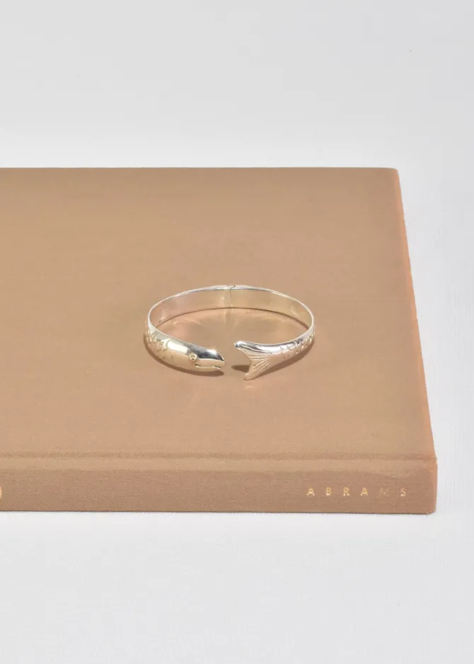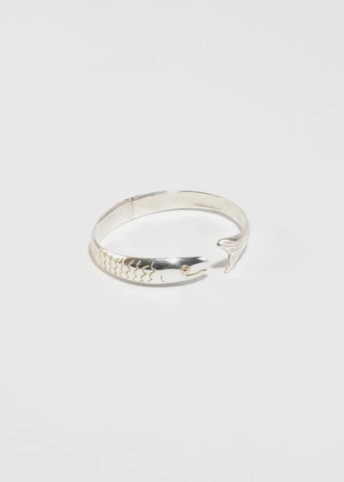 Rare, vintage sterling cuff bracelet in the shape of a fish with gold eye detail and hinge closure. Stamped,925.