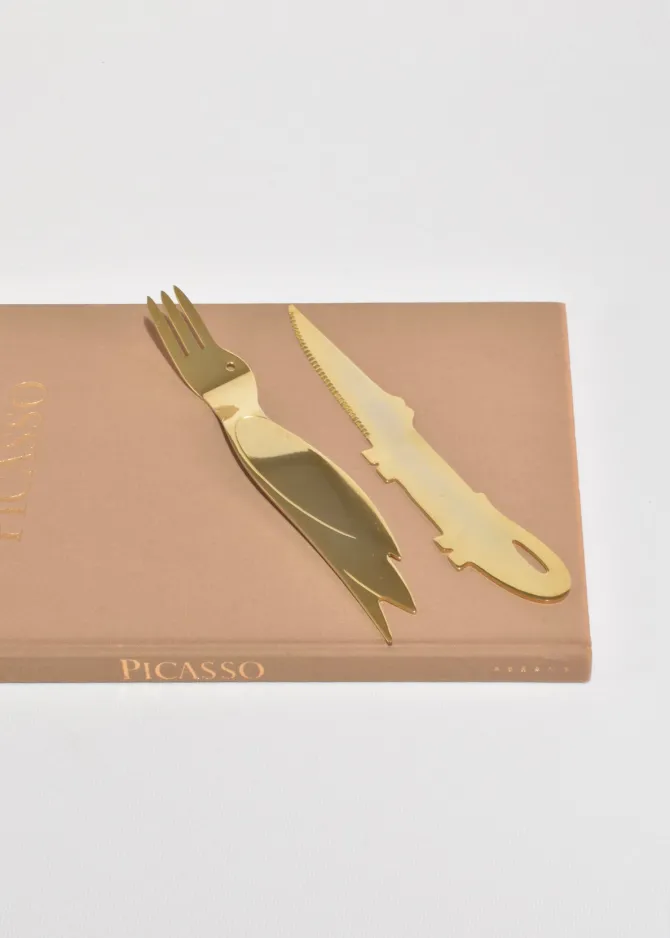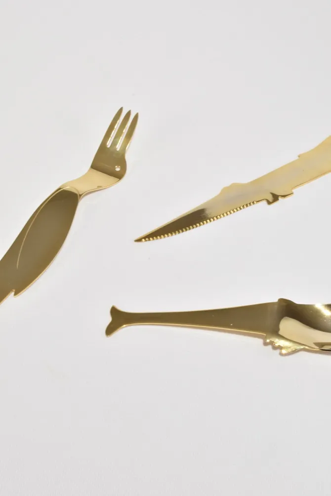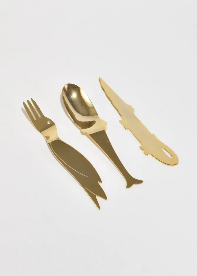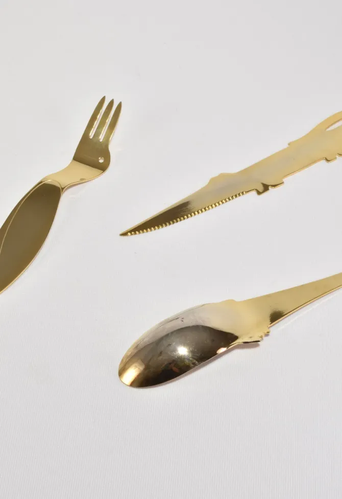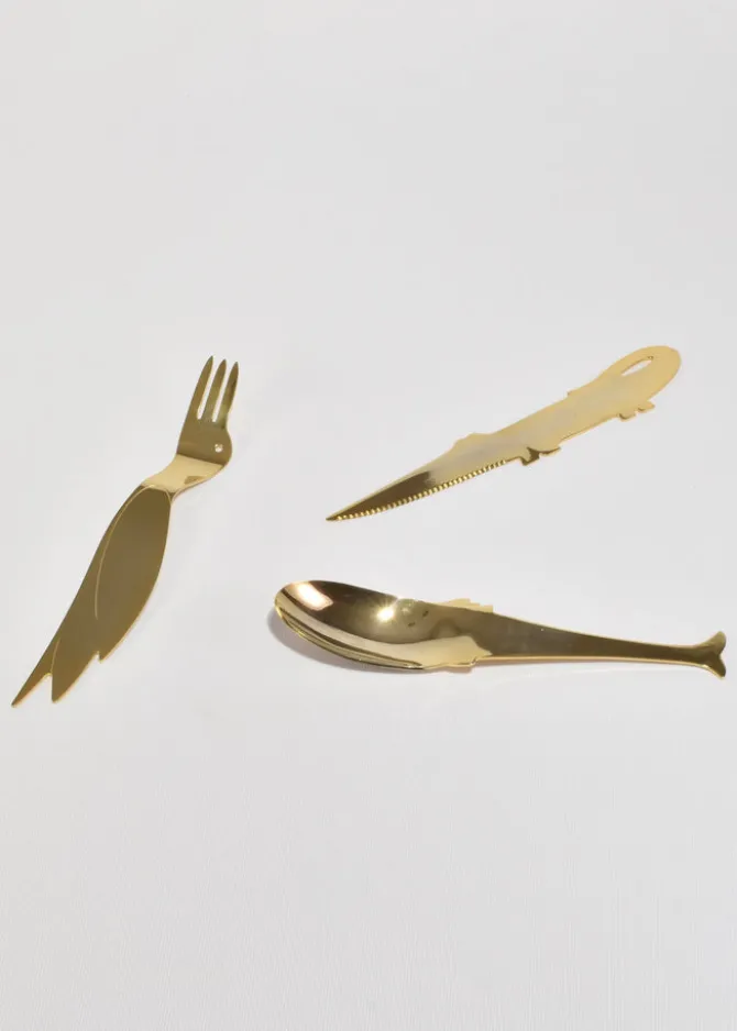 Rare, vintage stainless steel flatware set of three pieces in abstract animal shapes. Not signed, attributed to Jean-Marie Patois.