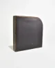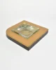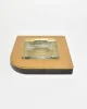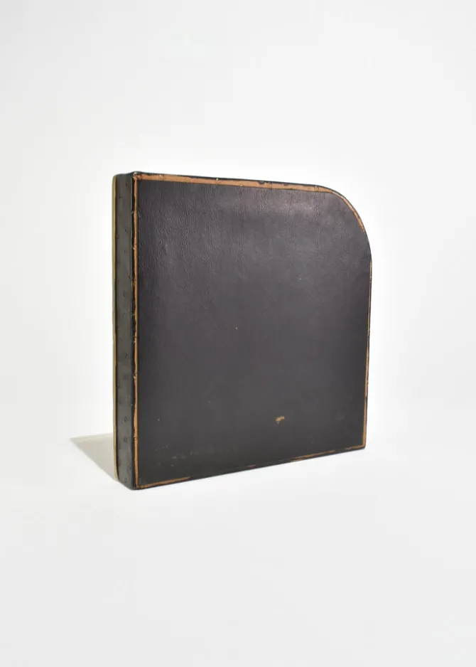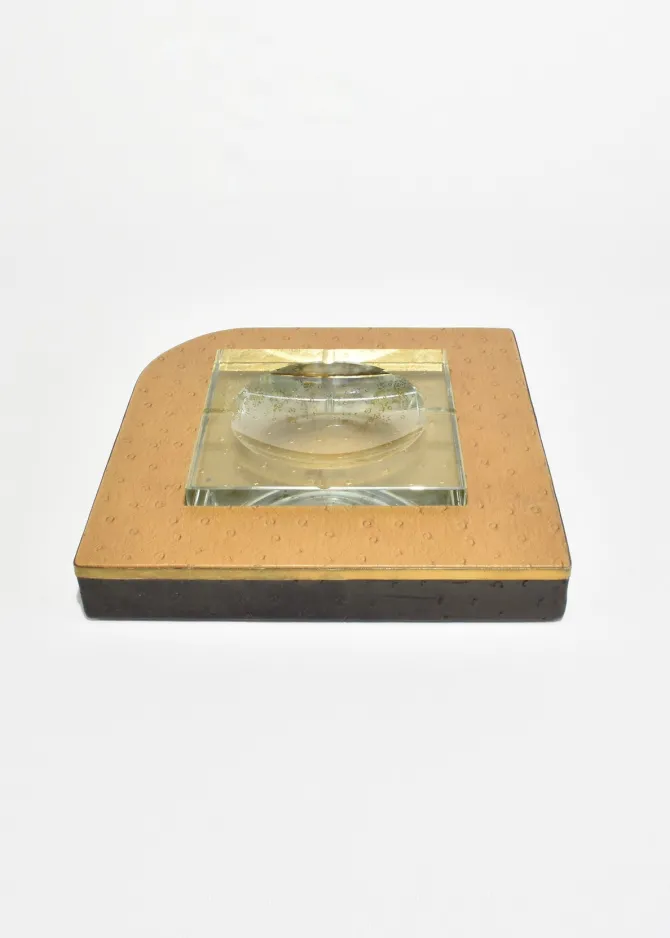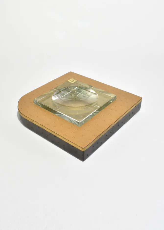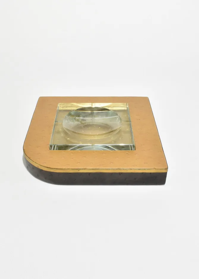 Rare, large leather-wrapped ashtray with an inset crystal bowl, finished in ostrich leather with a subtle dotted texture and a gilt edge. The weighty crystal center is set into a square form, giving the piece a sculptural, architectural presence. French, in the style of Dupré-Lafon, and may function as either an ashtray or a catchall.