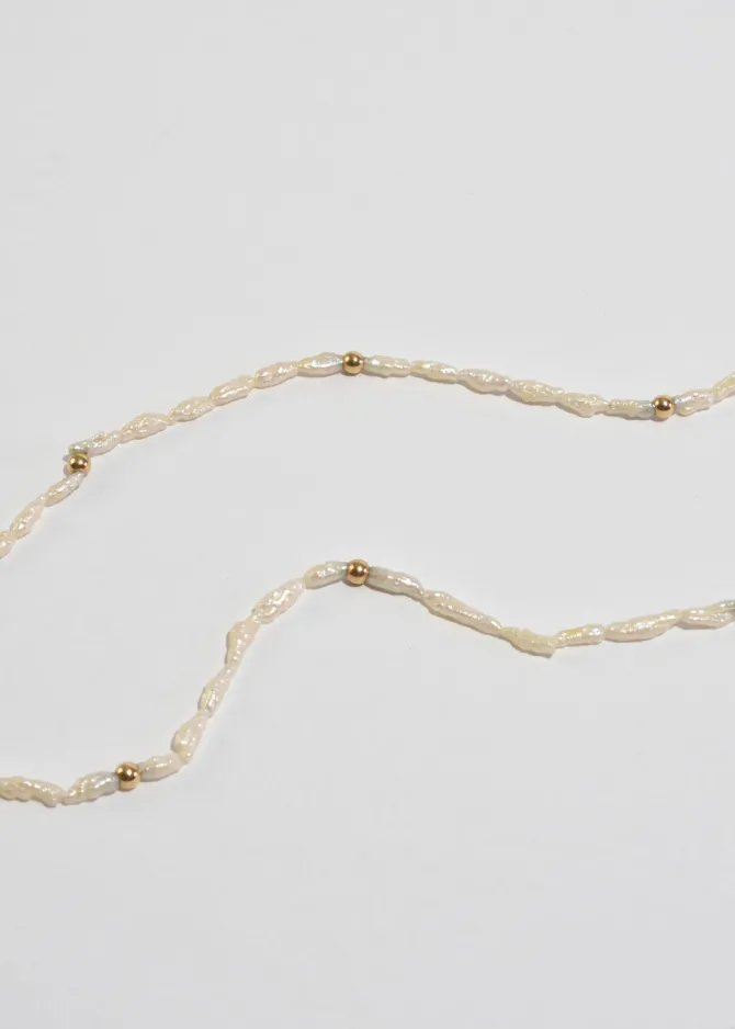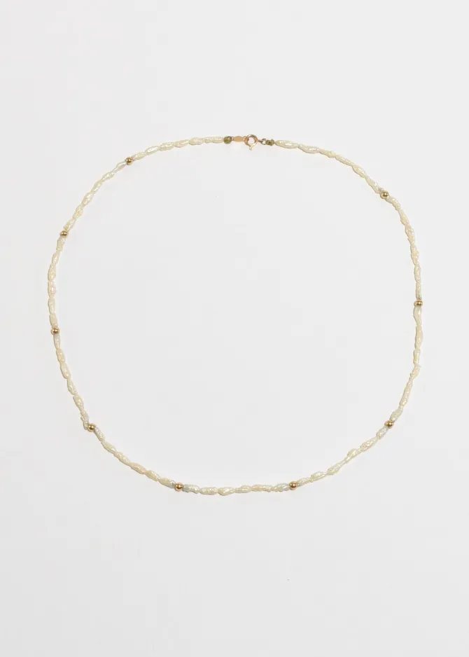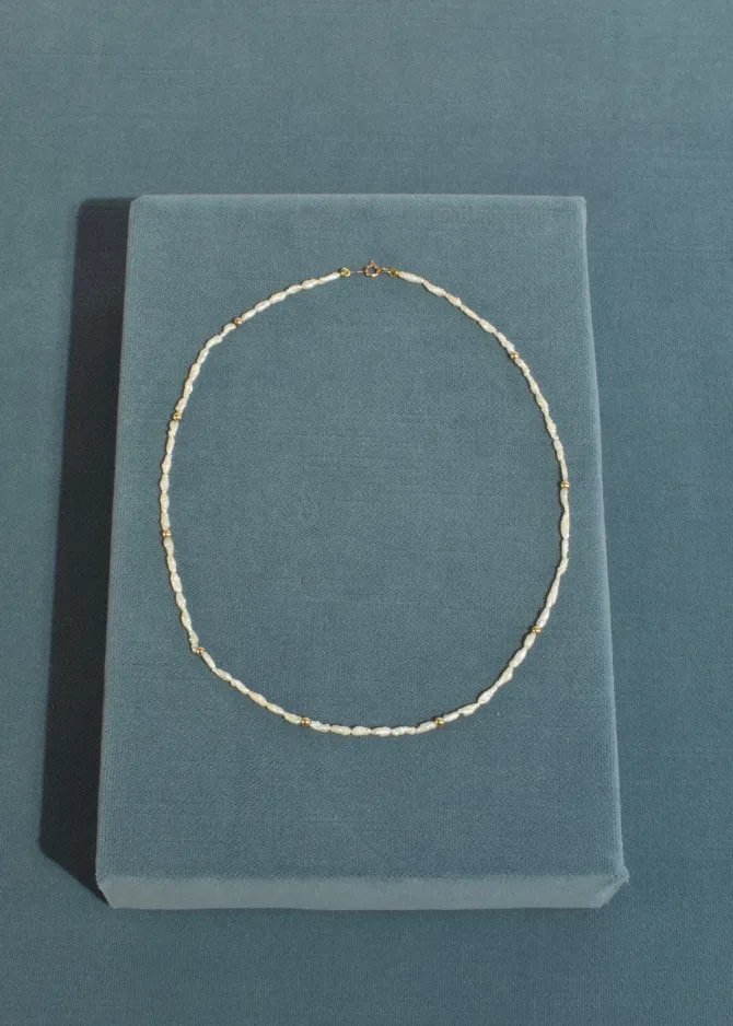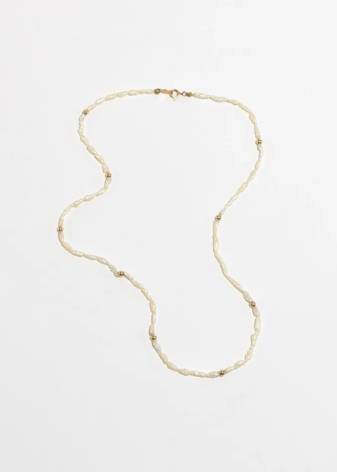 Vintage necklace with petite freshwater pearls and gold bead detail with clasp closure. Stamped 14k.
