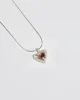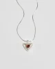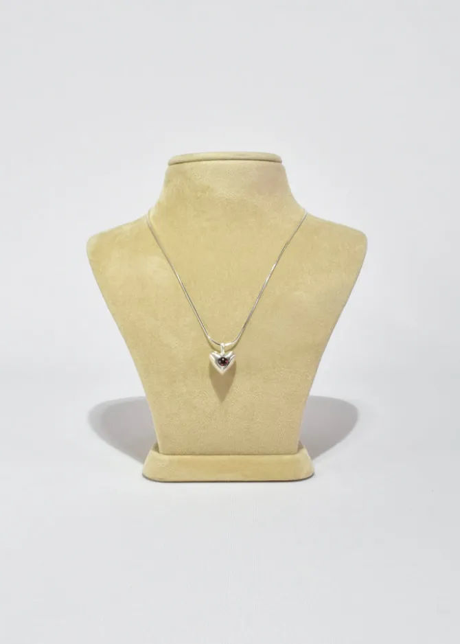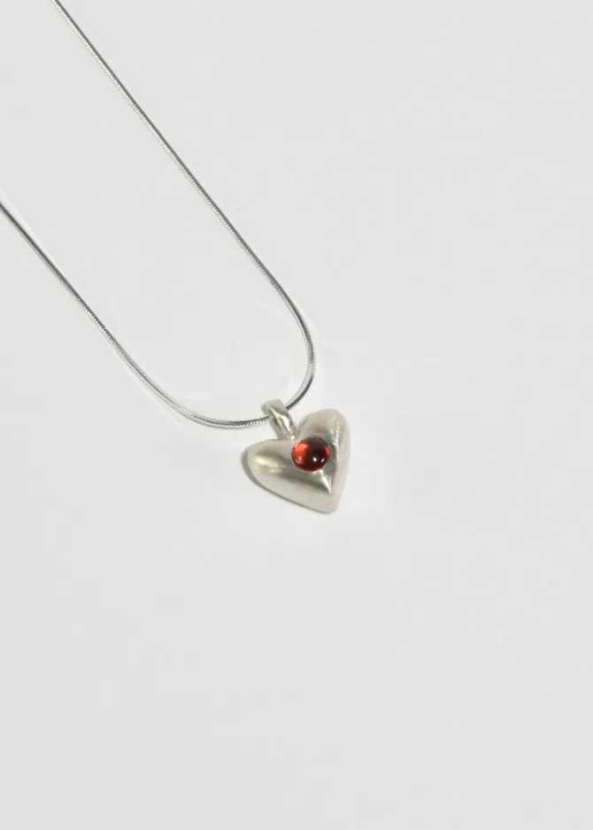 Sterling necklace with a heart pendant and garnet detail. Clasp closure. Inspired by depictions of the Heart as it appeared in early American decorative arts.