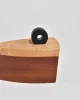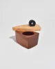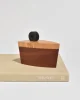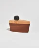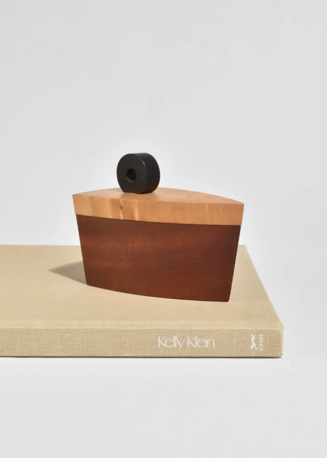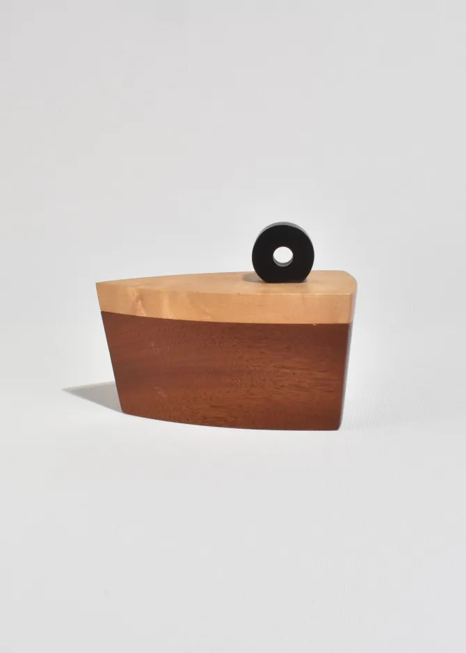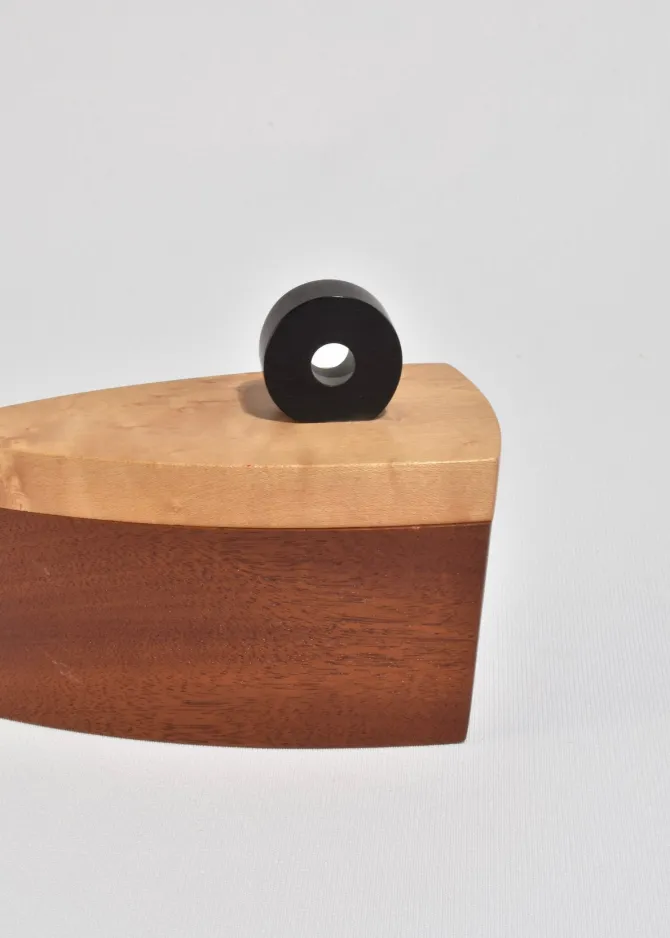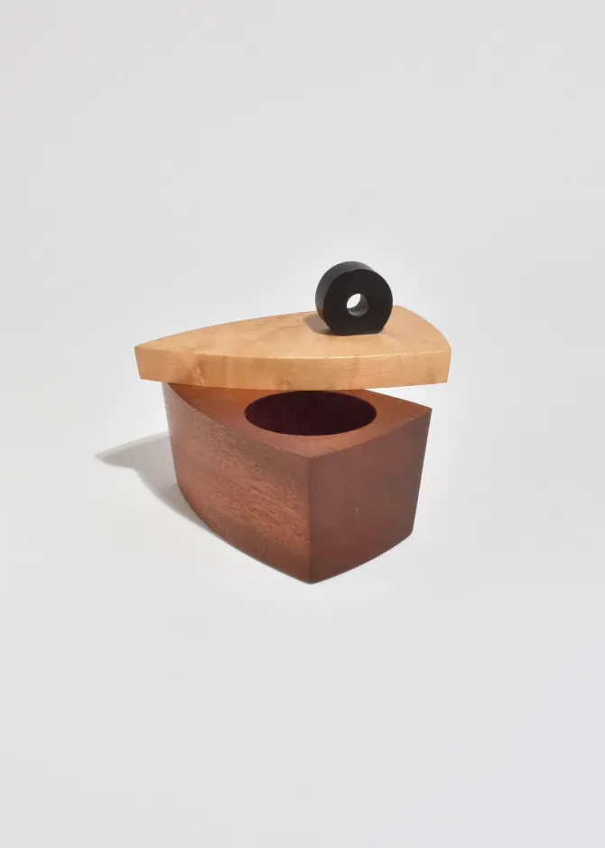 Handcrafted wooden box composed of maple and mahogany with a sculptural black handle. The lid pivots smoothly to reveal a circular velvet-lined interior.