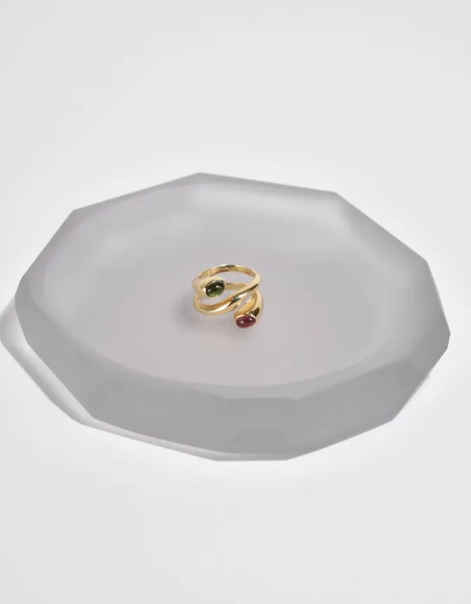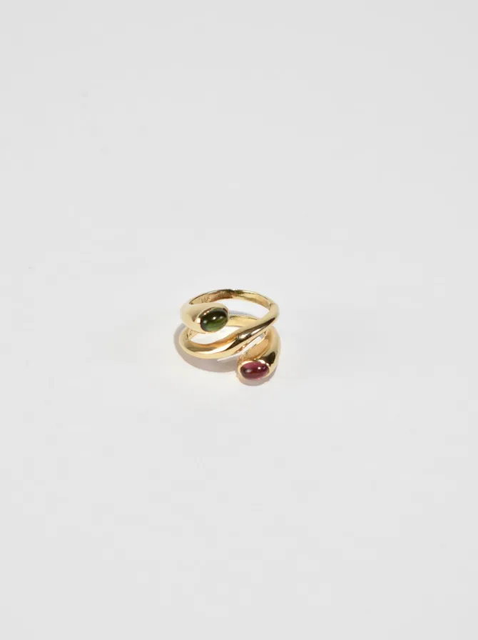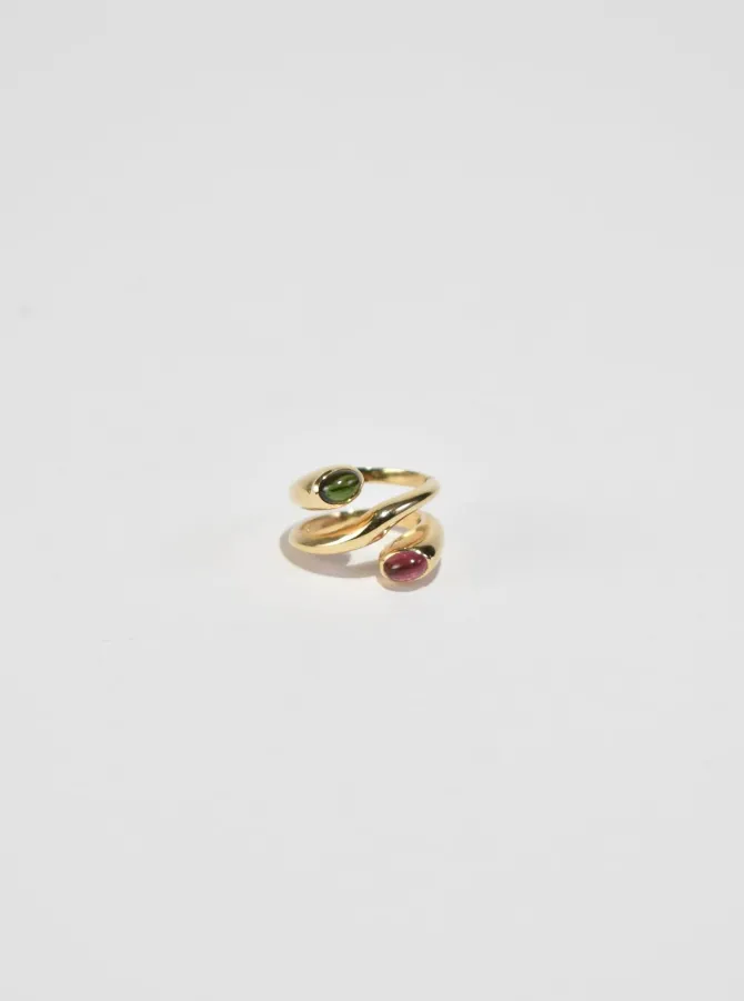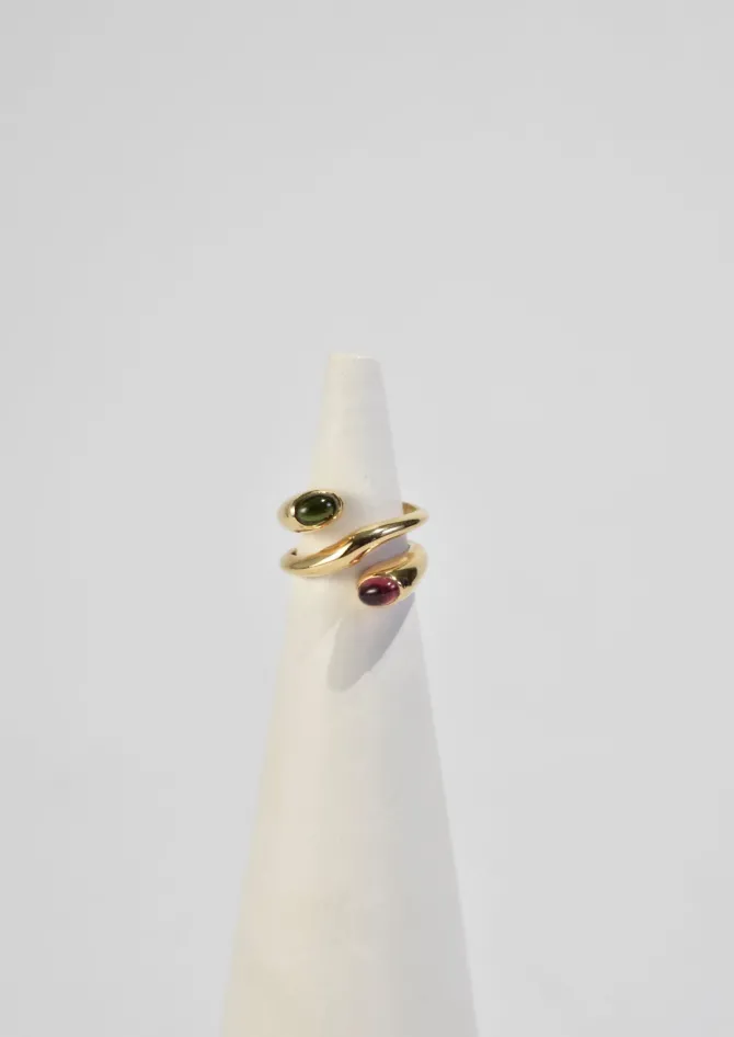 Stunning vintage gold wrap around ring with pink and green tourmaline detail. Stamped14k.