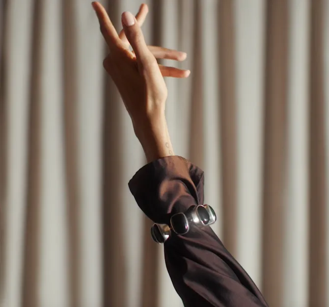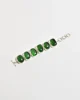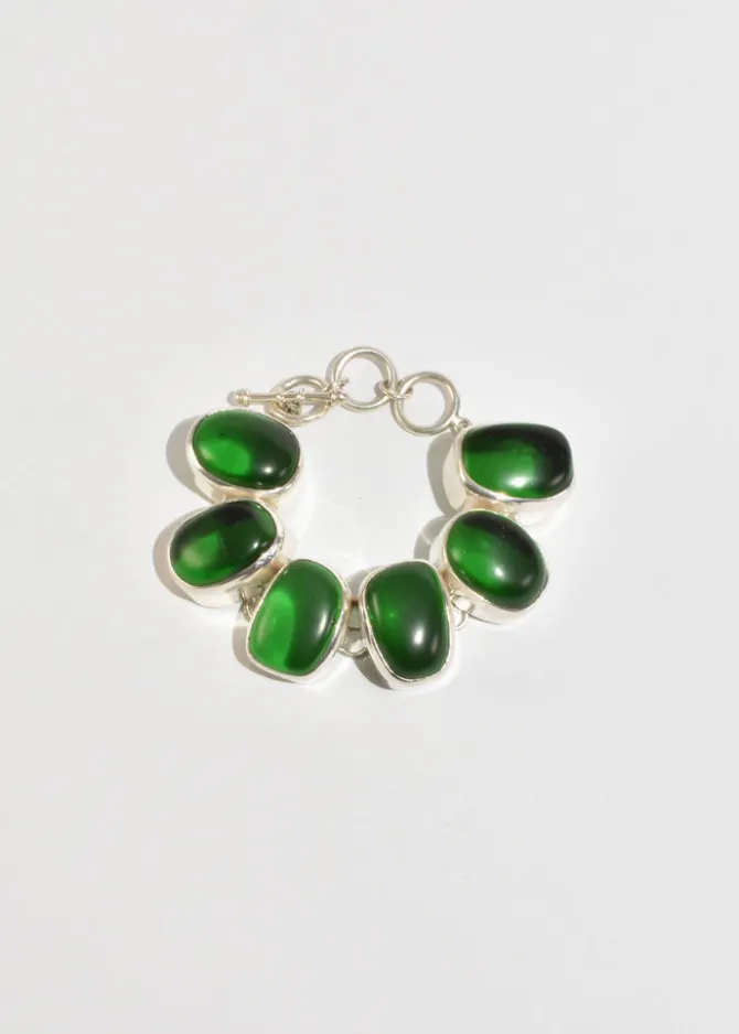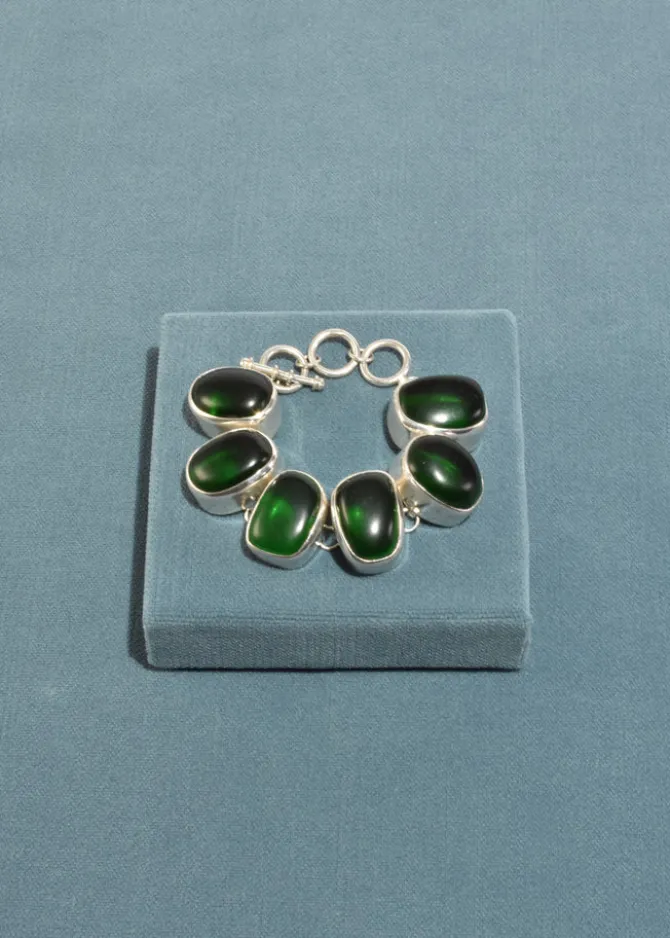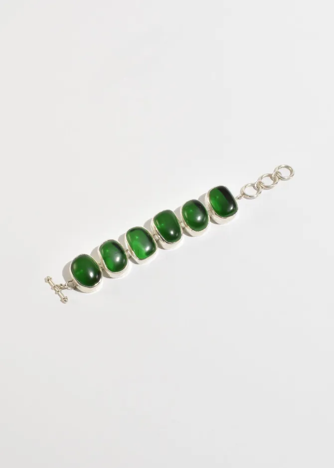 Rare, vintage sterling statement bracelet with large, organic shaped green glass cabochons and adjustable hook and eye closure. Stamped,Charles Albert Sterling Silver 925.