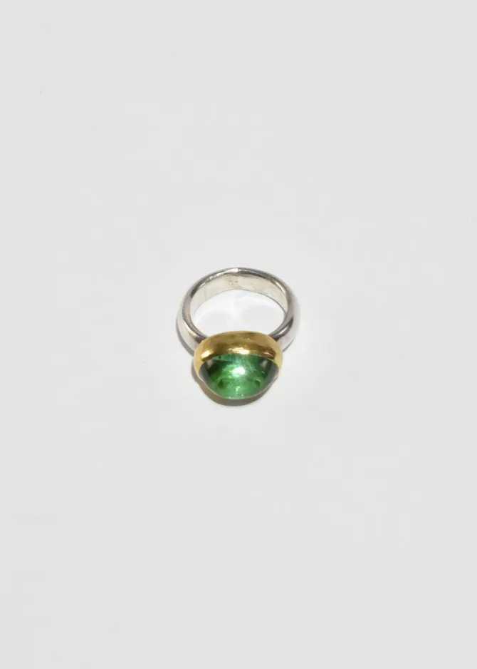 Rare, vintage handmade ring with a sterling band and a gold set green tourmaline cabochon.