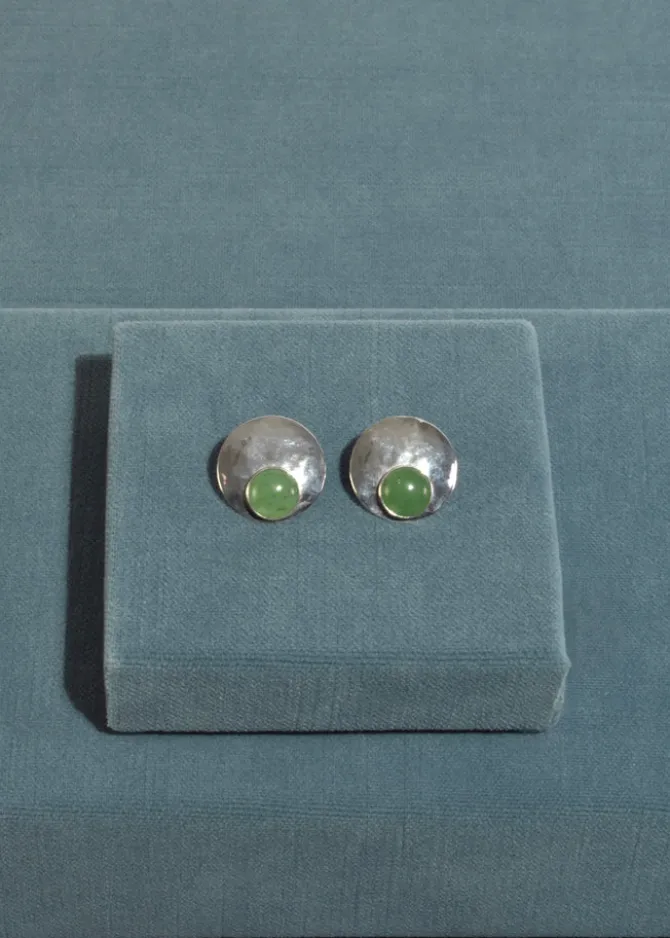 Beautiful, vintage sterling circle earrings with hammered texture and round aventurine cabochons, pierced.