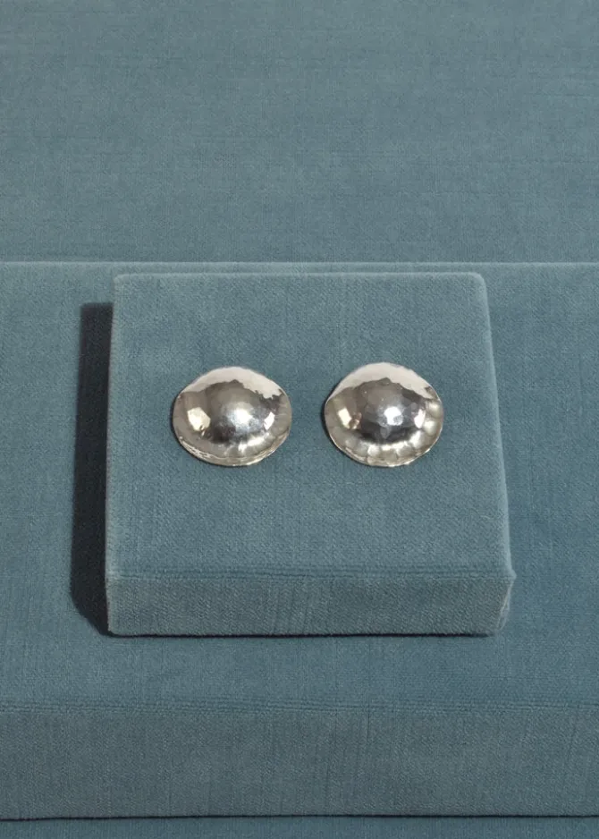 Classic, vintage earrings in a domed circle shape with hammered detail, pierced. Stamped,Sterling.