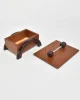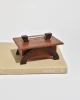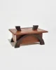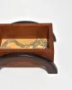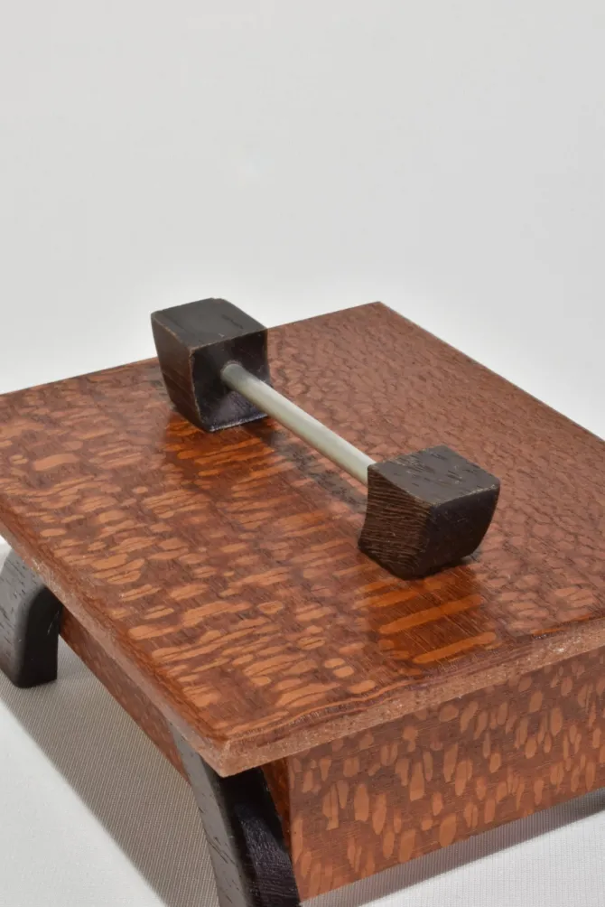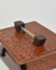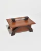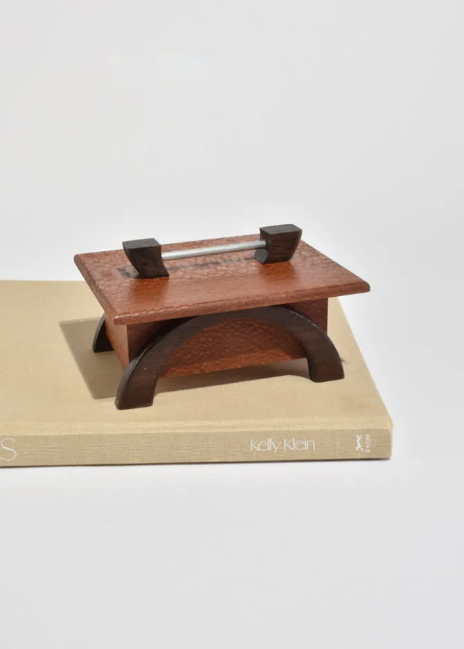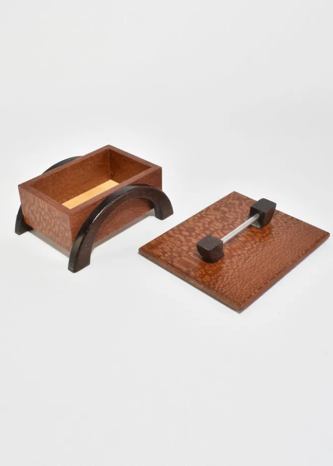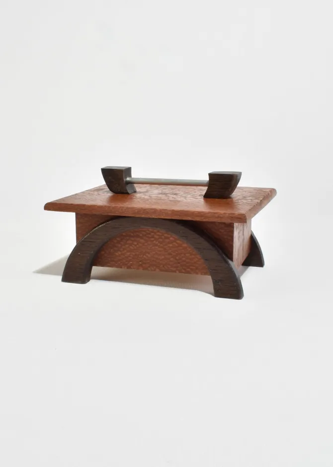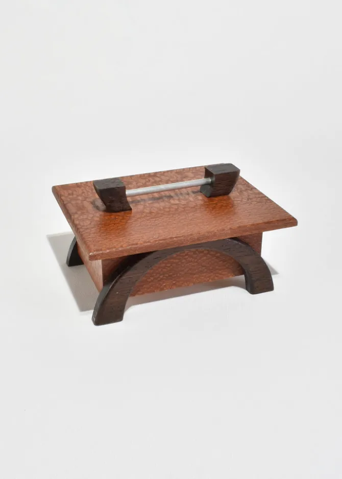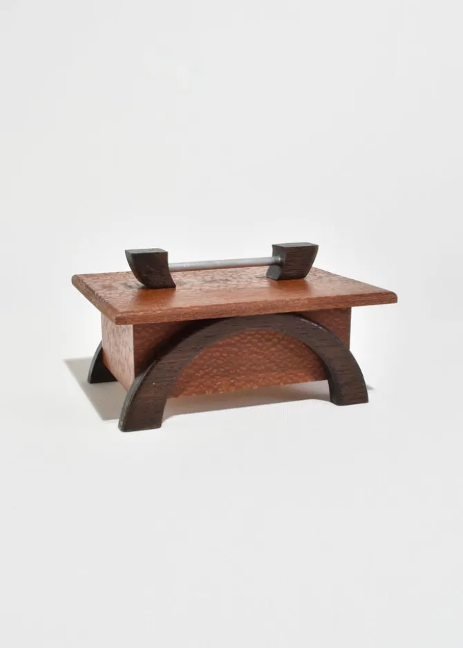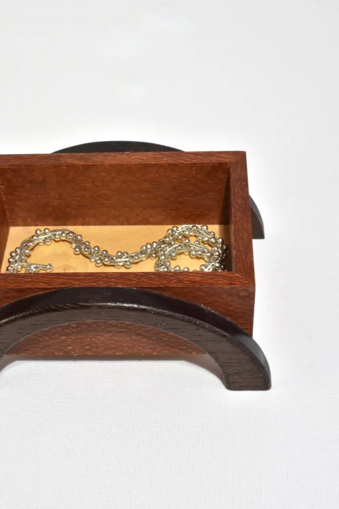 Arts & Crafts era box in oak with arched dark wood legs and a simple metal handle. The lift-off lid reveals a clean interior suited for small keepsakes or jewelry.
