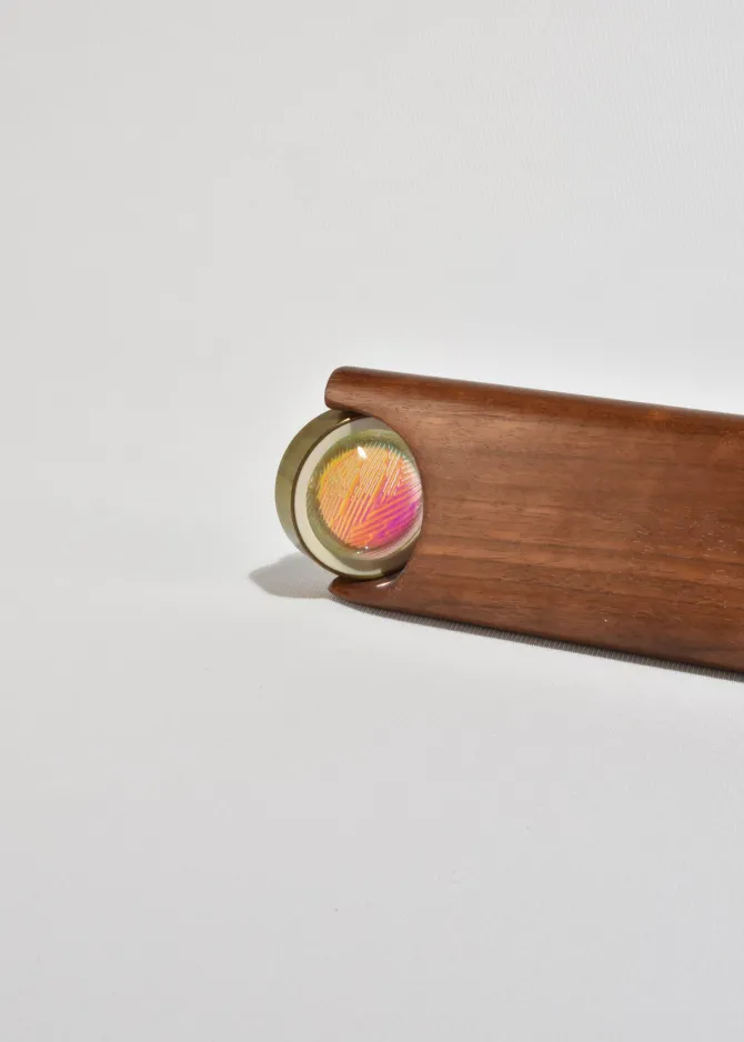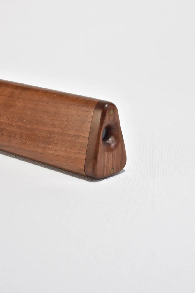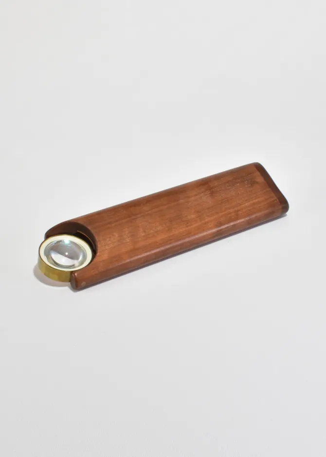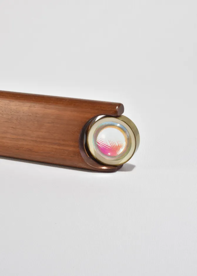 Vintage, expertly crafted kaleidoscope made of carved wood with a brass and glass pivoting lens.