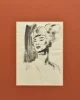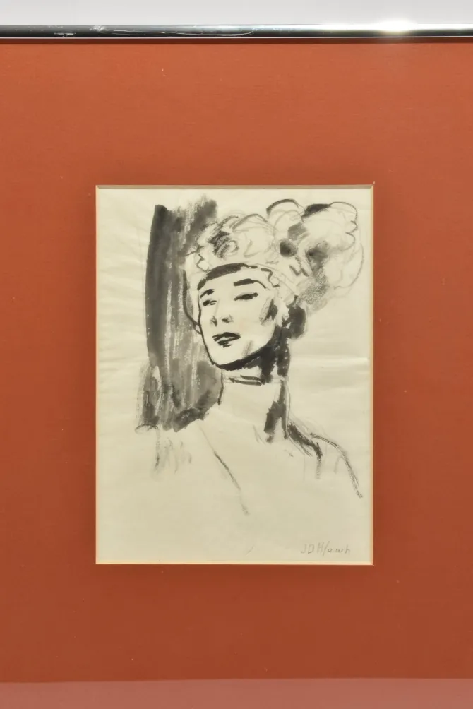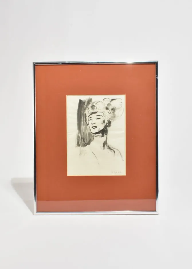 Framed ink and wash drawing on paper, signed lower right. The portrait depicts a figure in profile with elaborate headdress, rendered in expressive strokes.