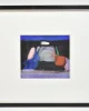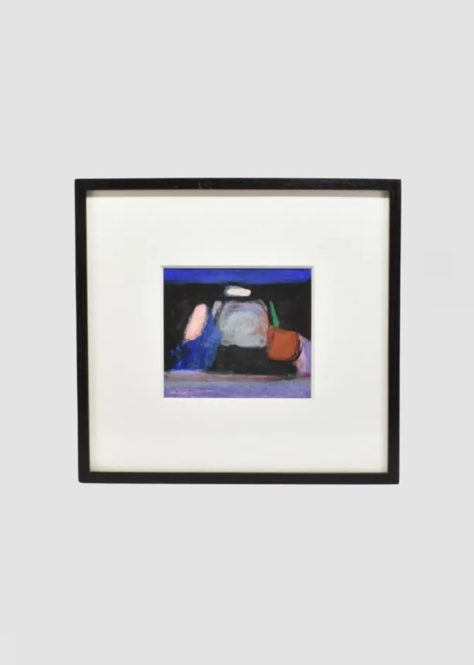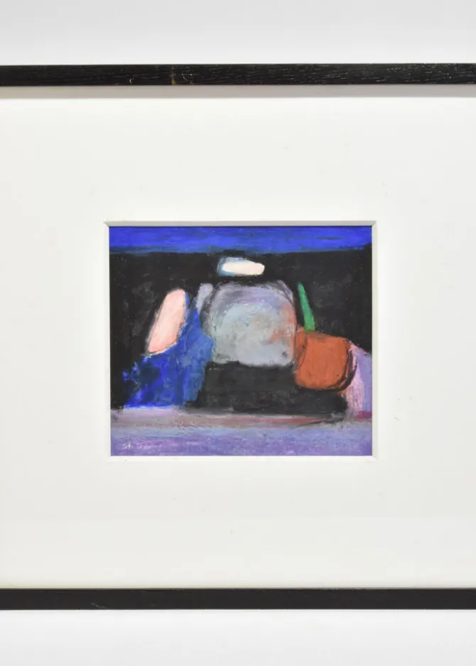 Oil pastel on paper, signed at lower left. A compact yet atmospheric abstraction, balancing deep ultramarine and black with luminous strokes of coral and green.