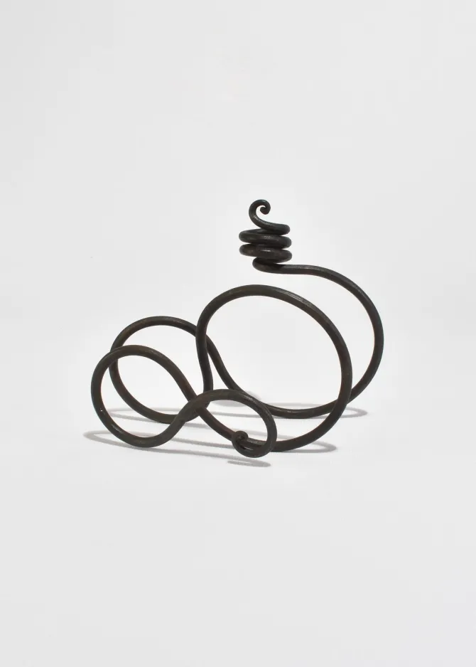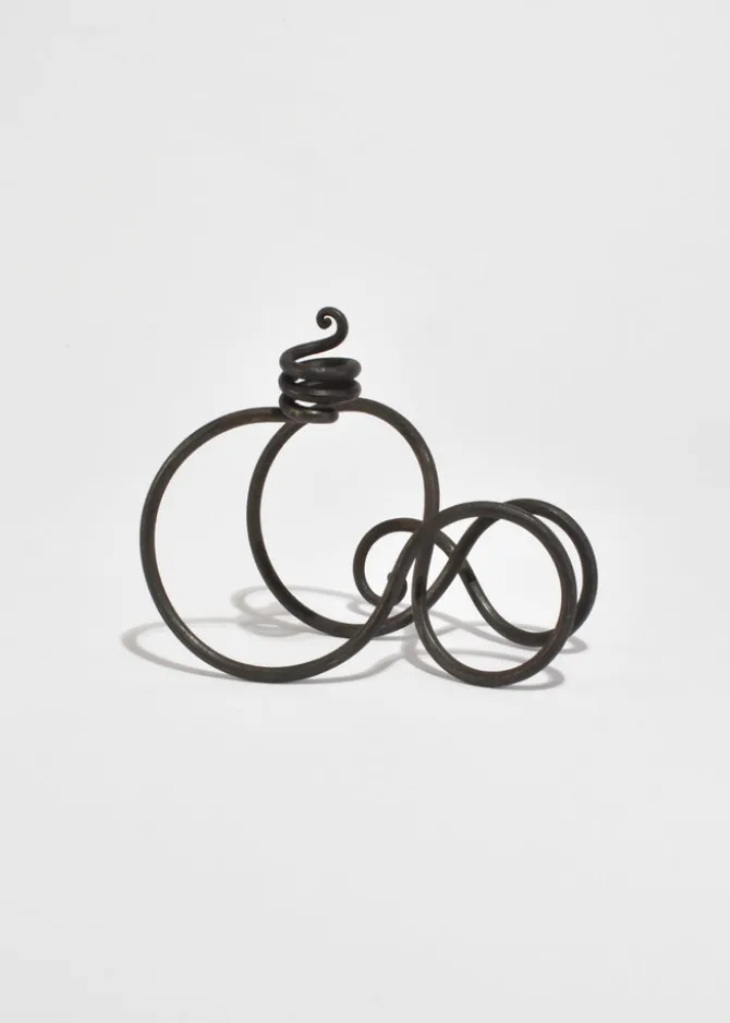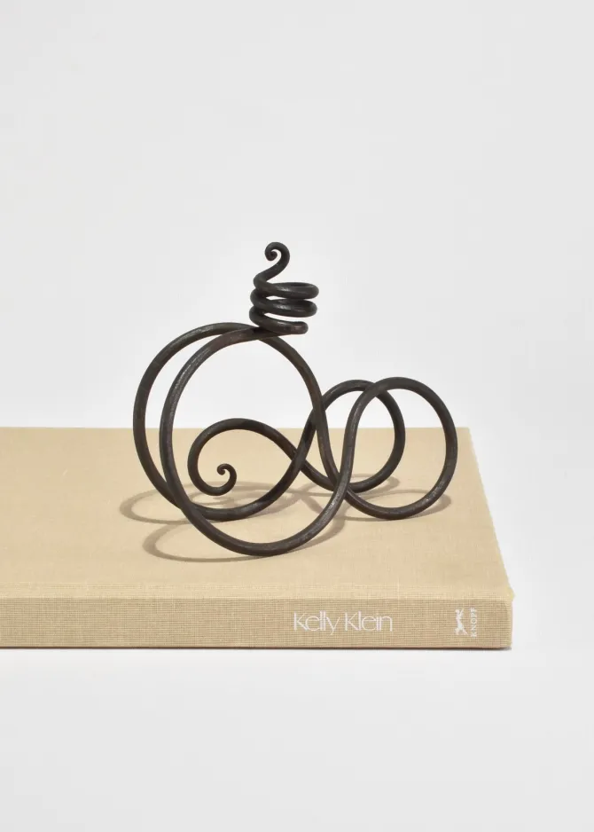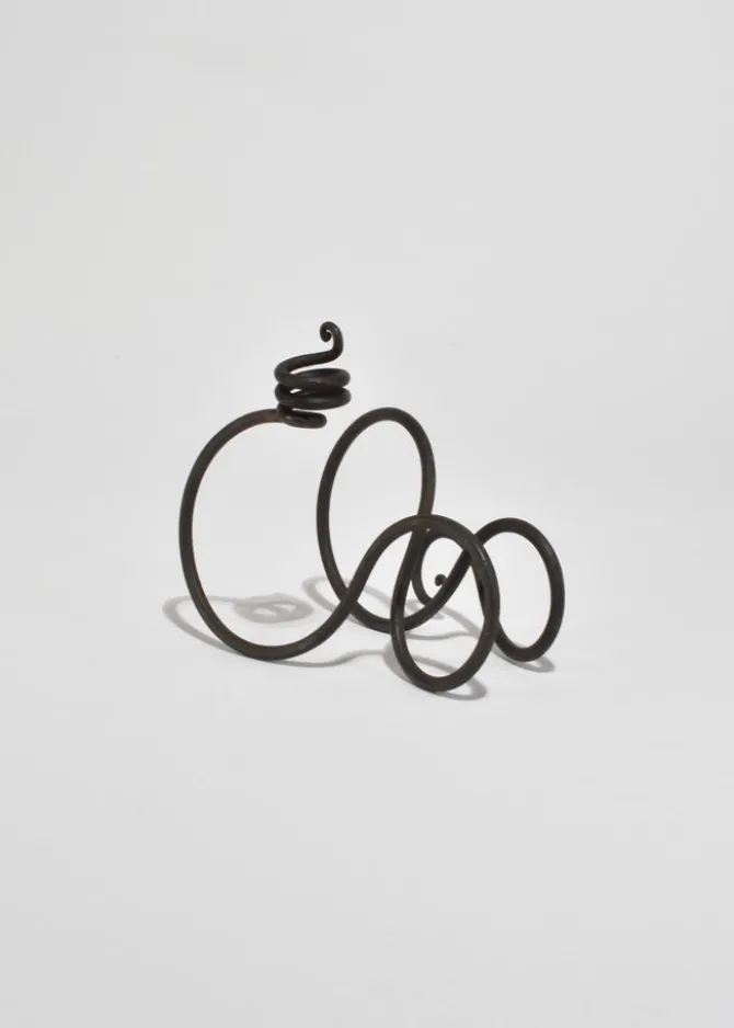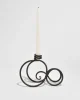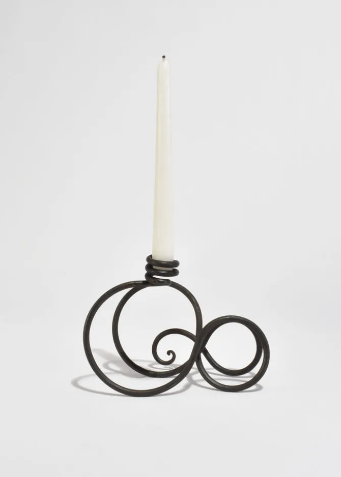 Hand-forged wrought iron candleholder with spiral scrollwork and a coiled top designed to hold a taper candle.