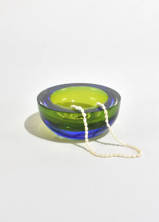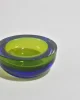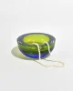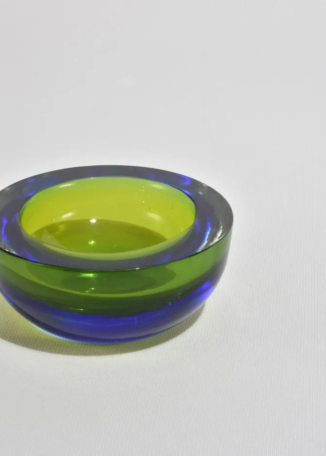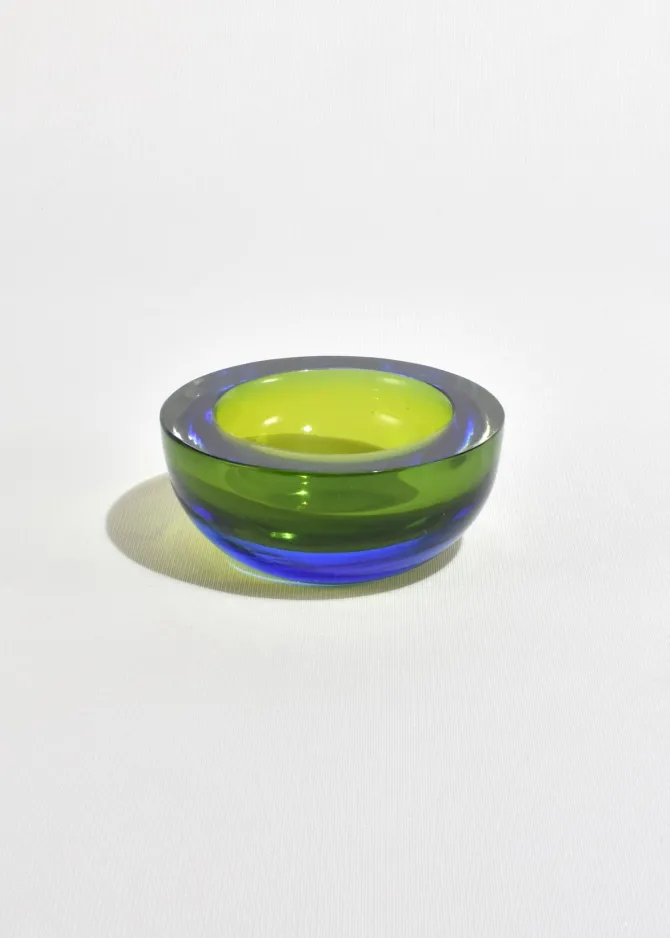 A heavy sommerso glass bowl in chartreuse with a cobalt rim. The thick, rounded form catches light beautifully, shifting from bright yellow-green to deep blue at the edge. Made in Italy.