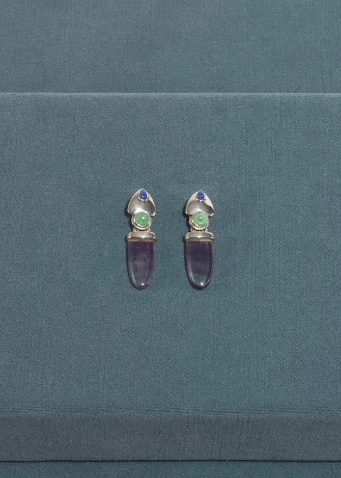 Rare, vintage sterling earrings with elongated fluorite stones and lapis and aventurine detail, pierced. Stamped,925.