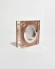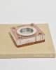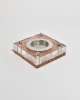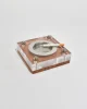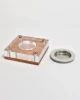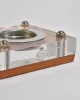 A substantial mid century ashtray crafted in thick, high-clarity lucite with a wood base and polished metal insert. Includes original sticker reading: Astrolite Products, Ritts Co. L.A.
